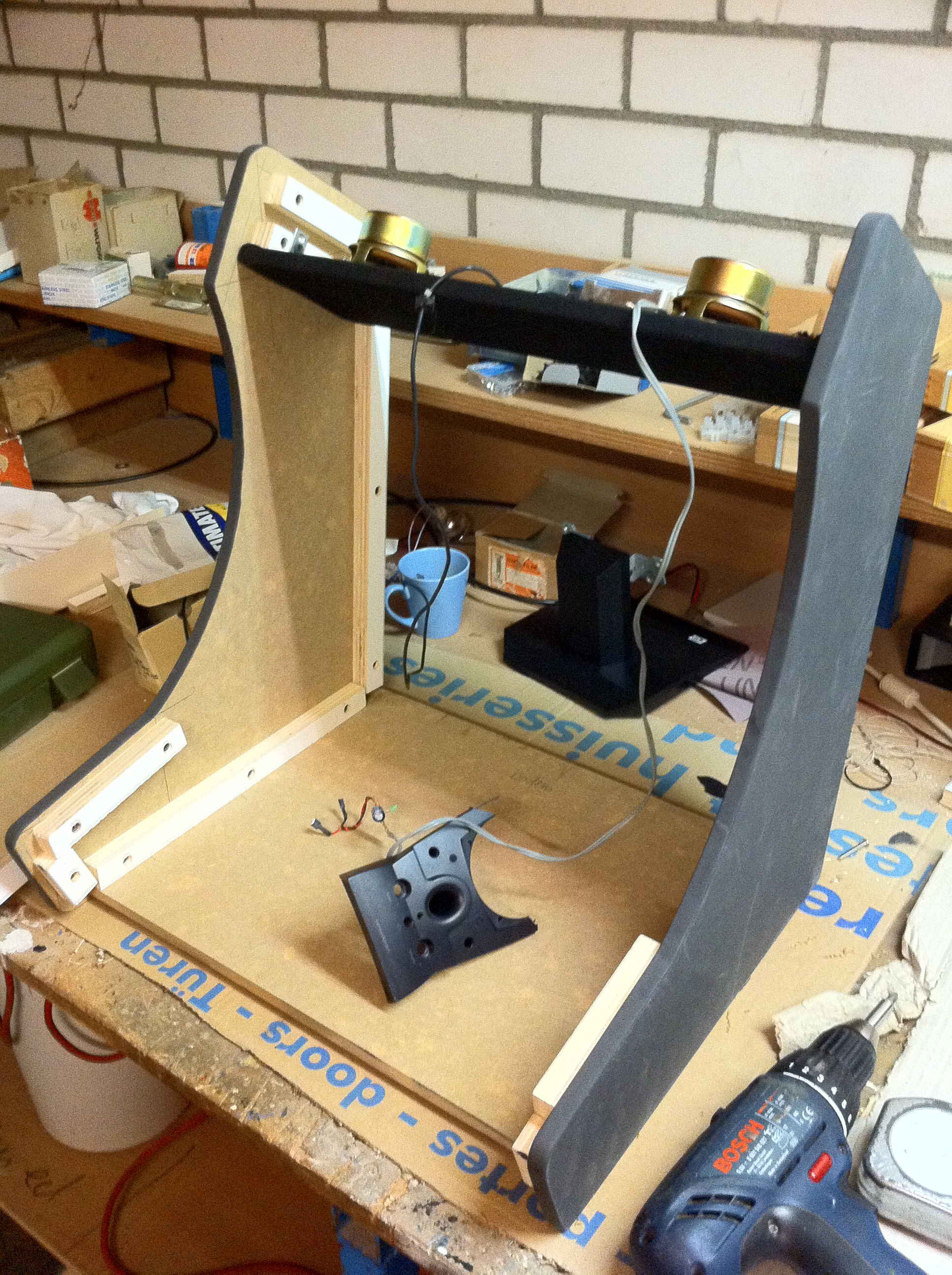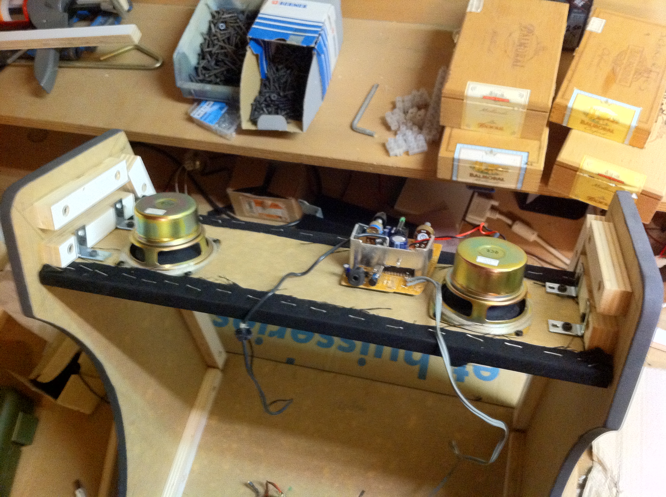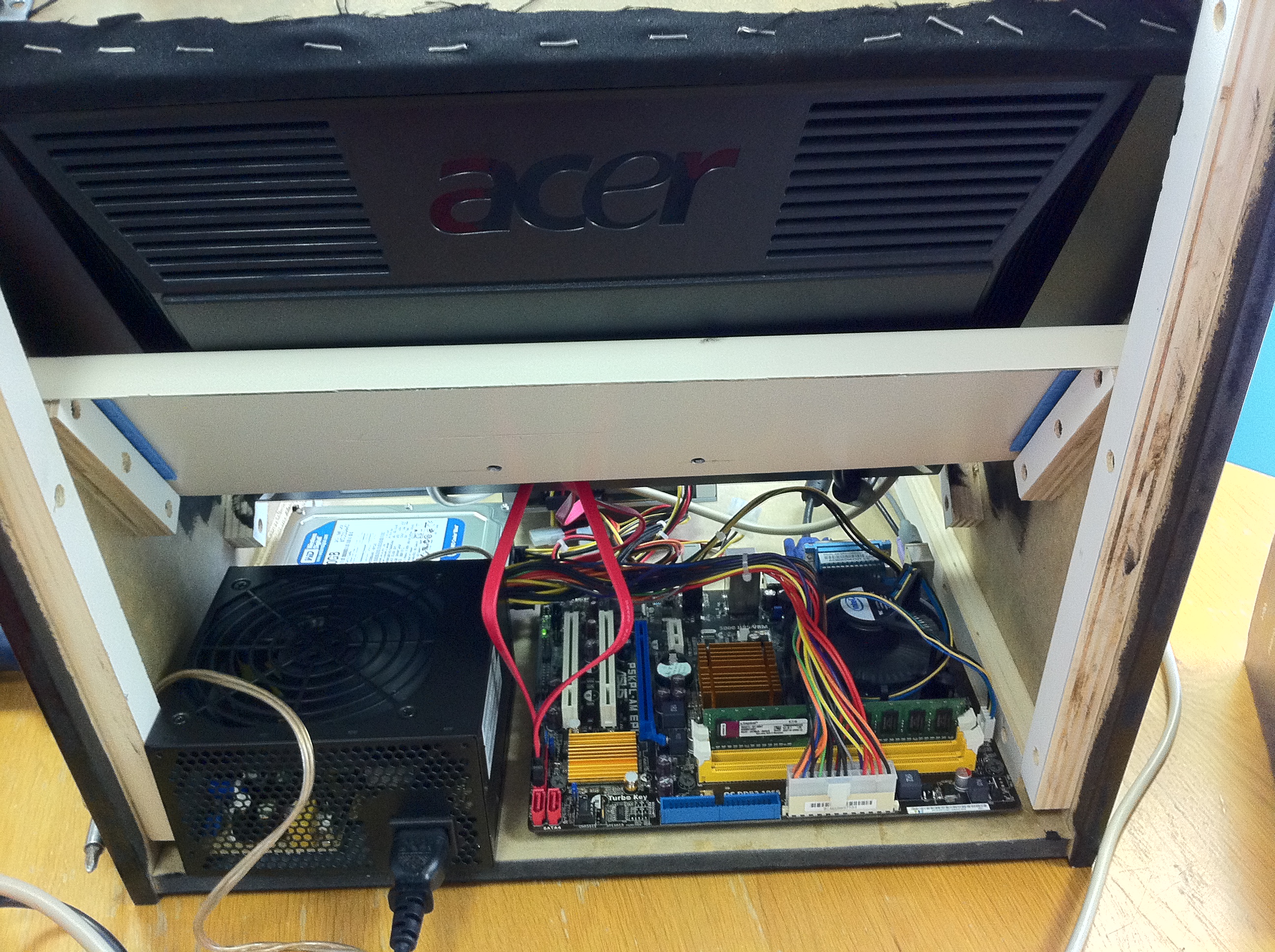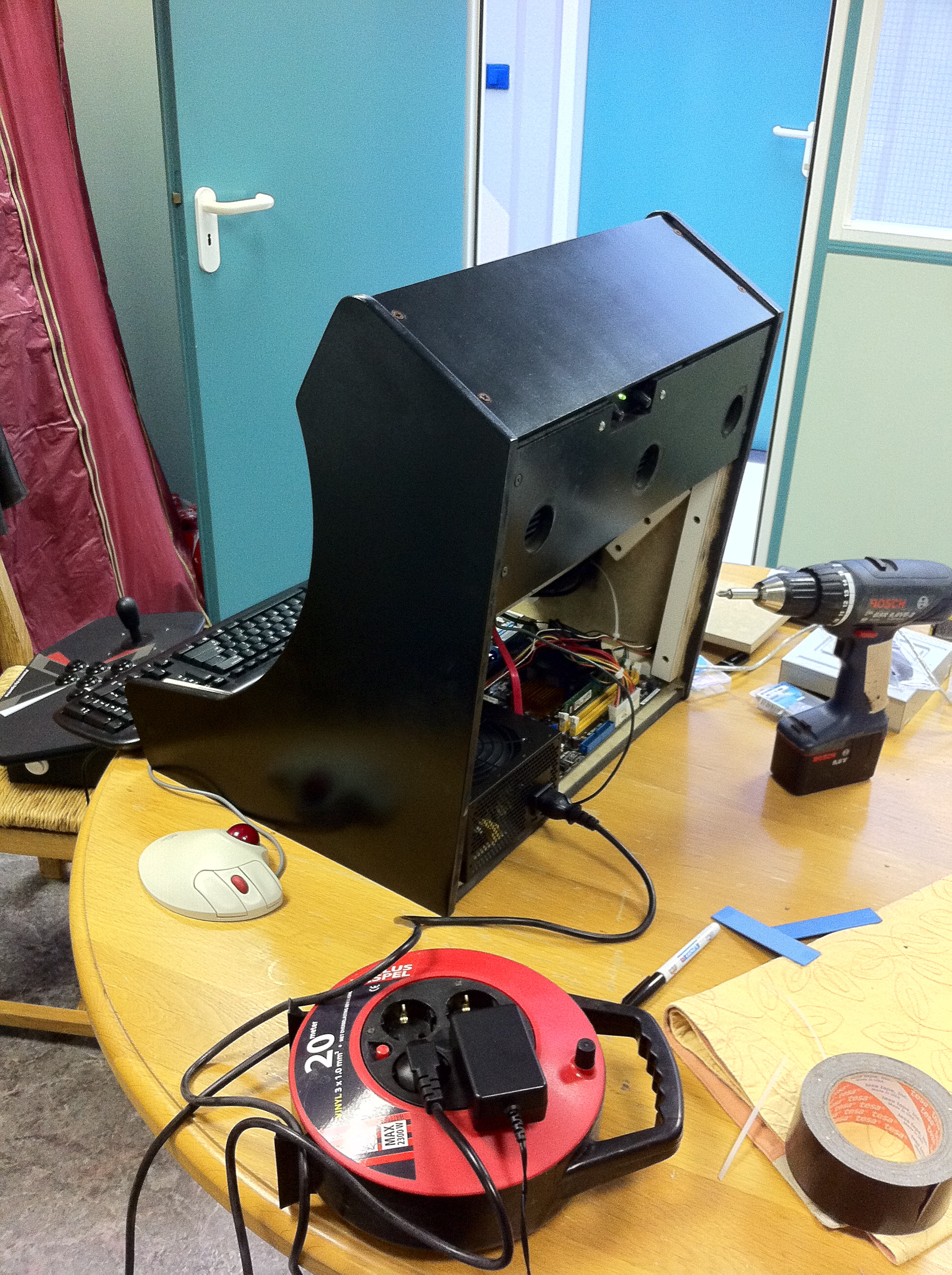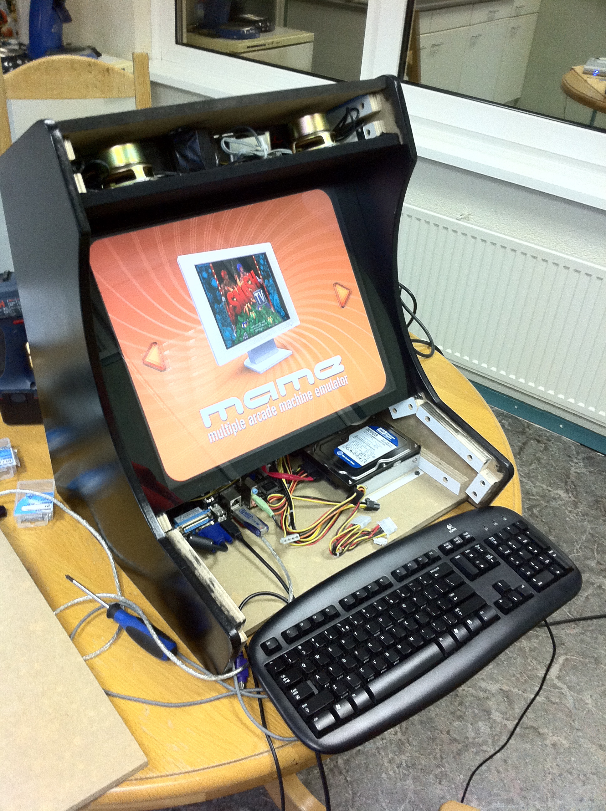 De voeding is een standaard PC voeding, waarvan ik 220volt heb afgetapt en waarop de voeding van de speakers en van de TFT monitor zijn aangesloten. Als ik de stekker in het stopcontact steek, krijgen deze dus ook automatisch stroom, zodat niet alles apart hoeft te worden ingeschakeld. De speakers en volumecontrols komen van een oude PC speakerset die ik nog had liggen. Dit is uit elkaar gesloopt, waarna het inwendige ervan is gebruikt en ik achterop de kast nu een volumeknop heb en een uitgang voor een koptelefoon, voor als je graag wil spelen zonder de omgeving te storen.