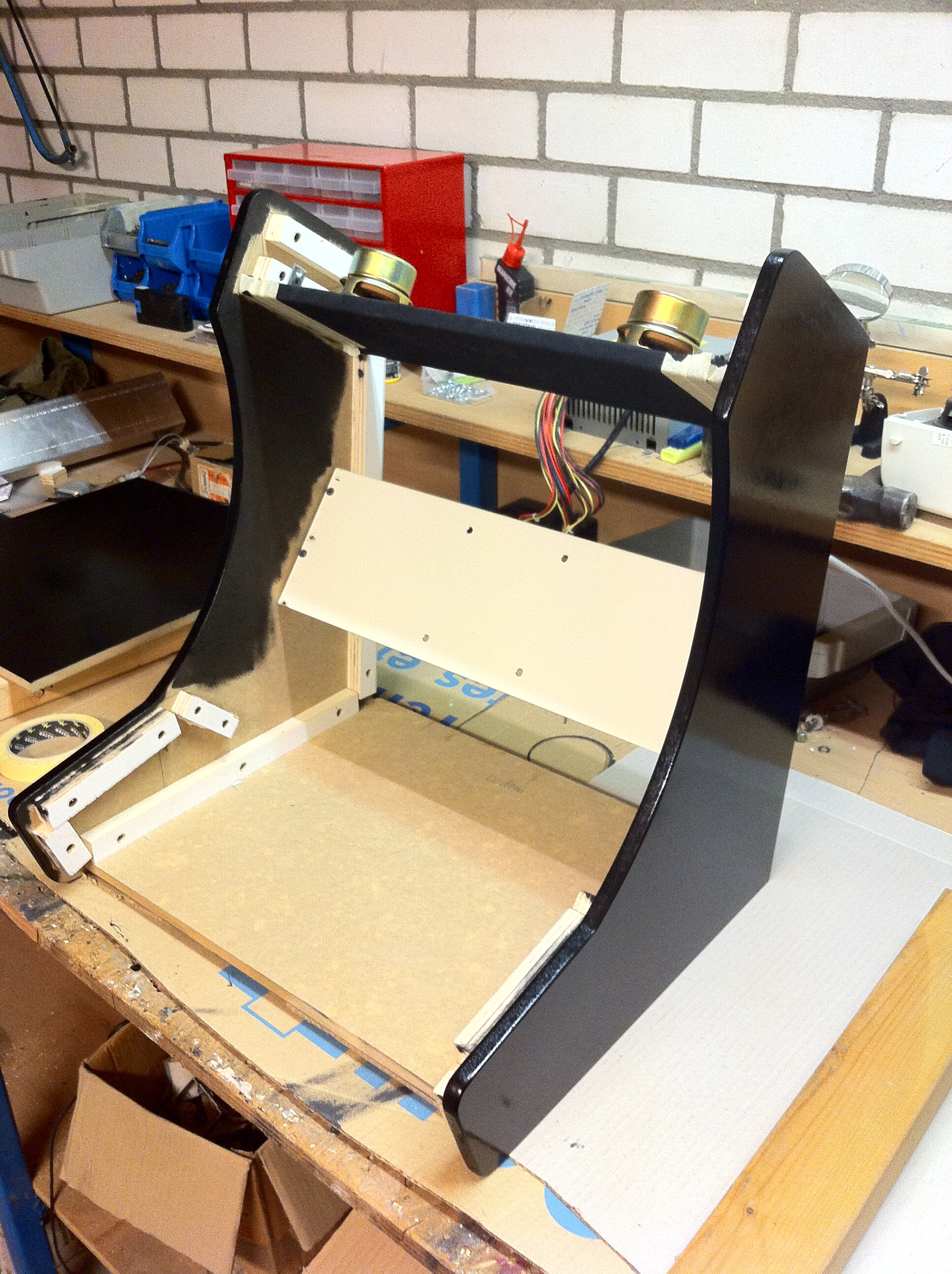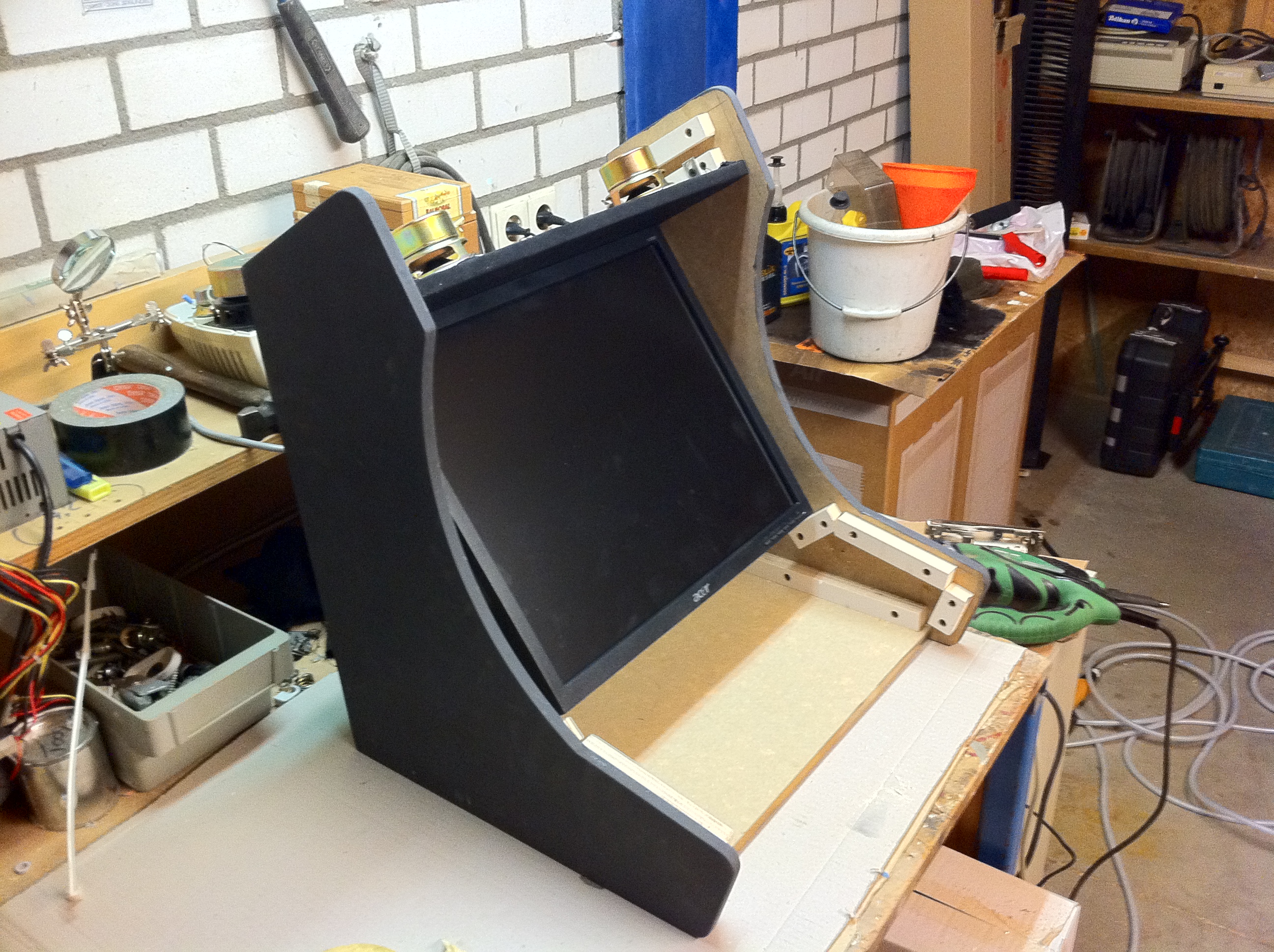 Het controlepaneel voor de joysticks wordt gemaakt uit gezet aluminium wat ik uiteindelijk zwart zal laten poedercoaten (de gehele kast wordt namelijk zwart). Het scherm is een normale 19″ TFT van Acer in het 4:3 formaat voorzien van een extra plexiglasplaat die alleen het scherm nog toont. Het moederboard is van Asus en is voorzien van een 3Ghz E5700 processor van Intel en 1GB aan RAM. Op een 320GB harddisk staat Windows XP en alle emulatoren, waaronder Mame, JNES, WinUAE en Stella.