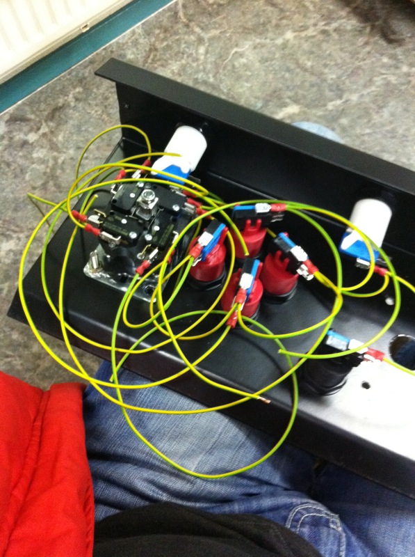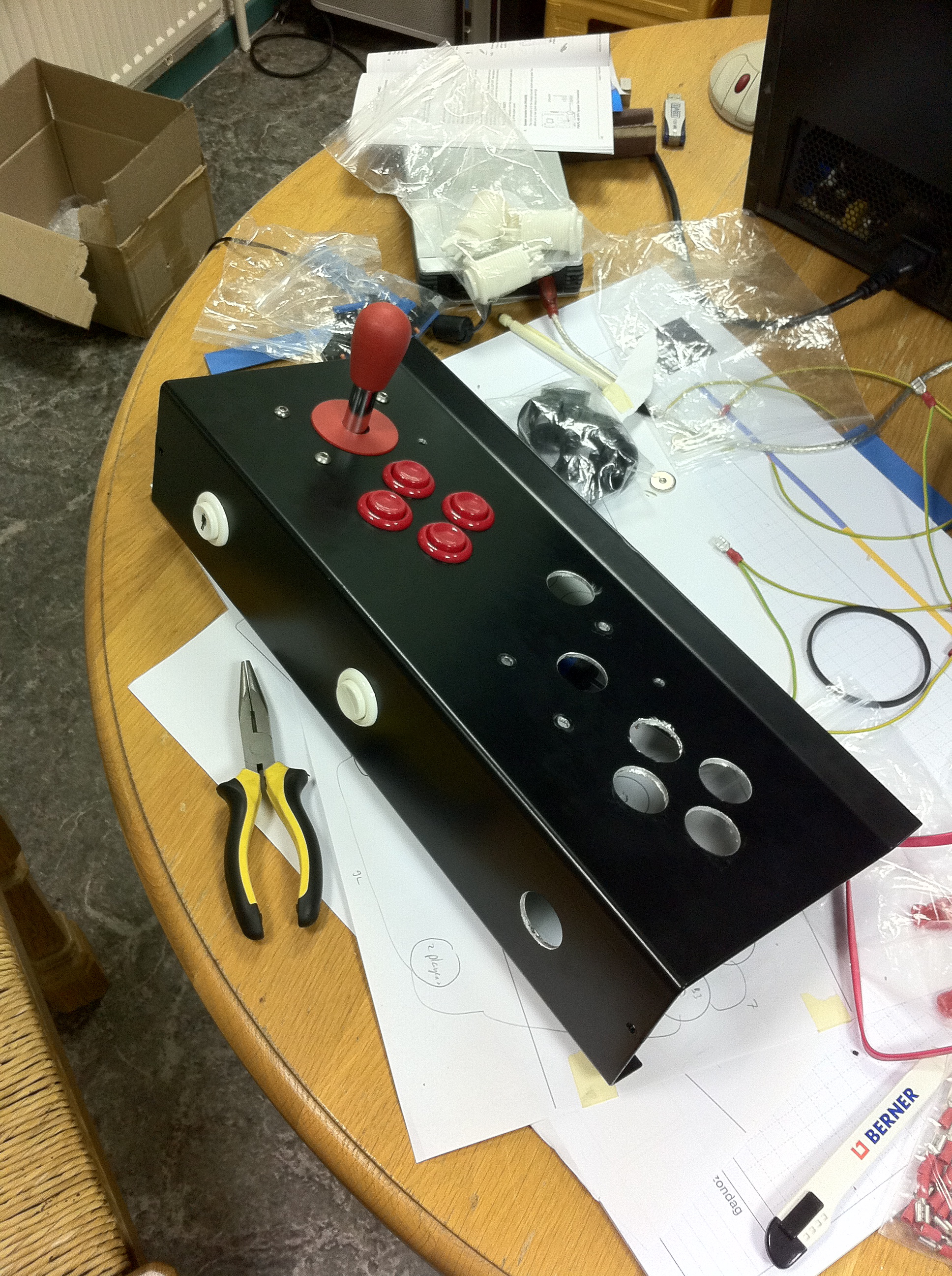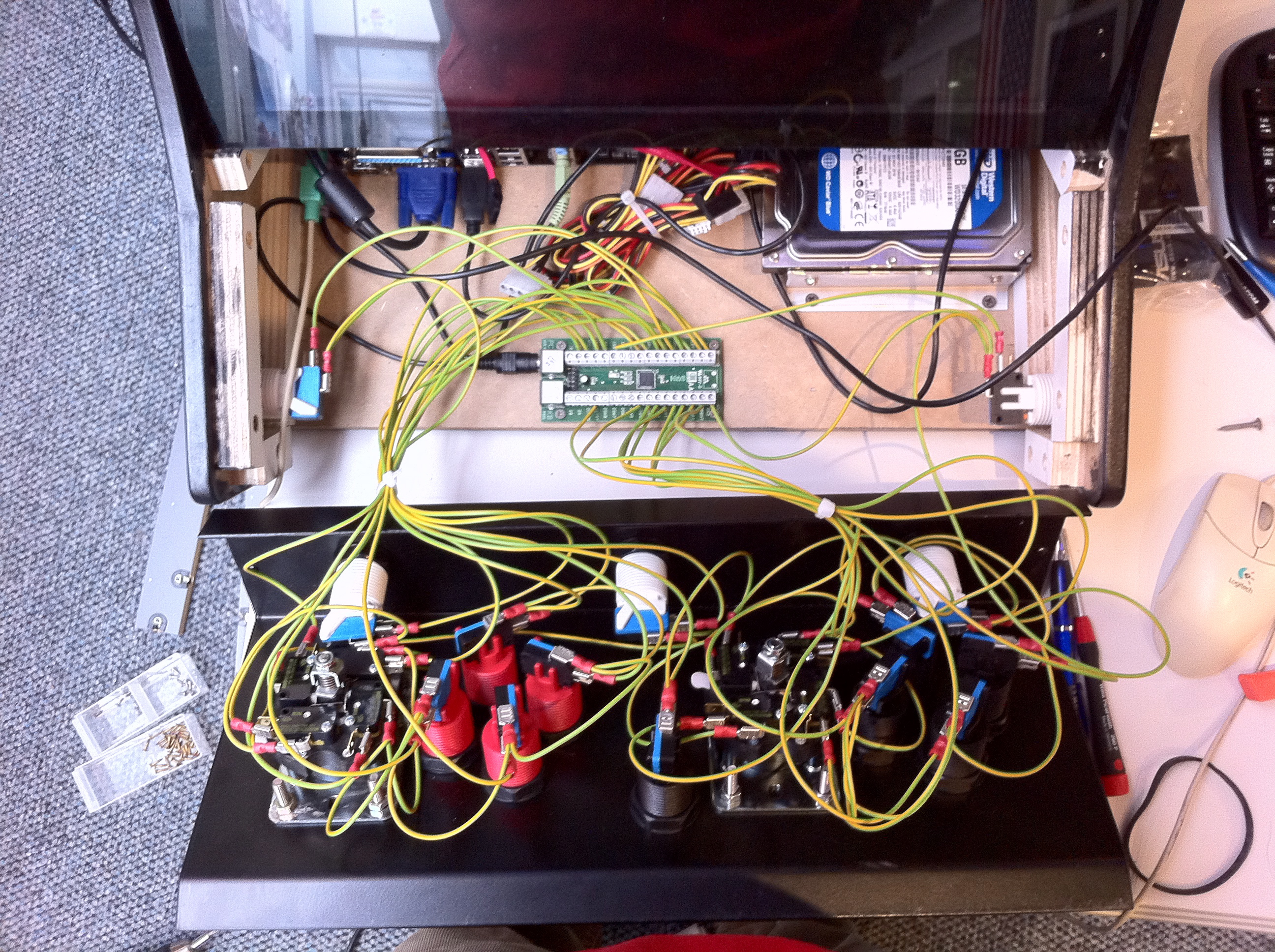 Helaas kwam ik er te laat achter dat de beide flipperknoppen (zijkant) in de weg zitten van de knoppen en stick op het bovenpaneel. Ik heb de ingebouwde flipperknoppen dan ook onbruikbaar moeten maken, zodat het allemaal net past nu. Niet zo erg: ik flipper toch nooit op een computer, dat doe ik straks wel op een echte flipperkast of op de Cocktail cabinet.