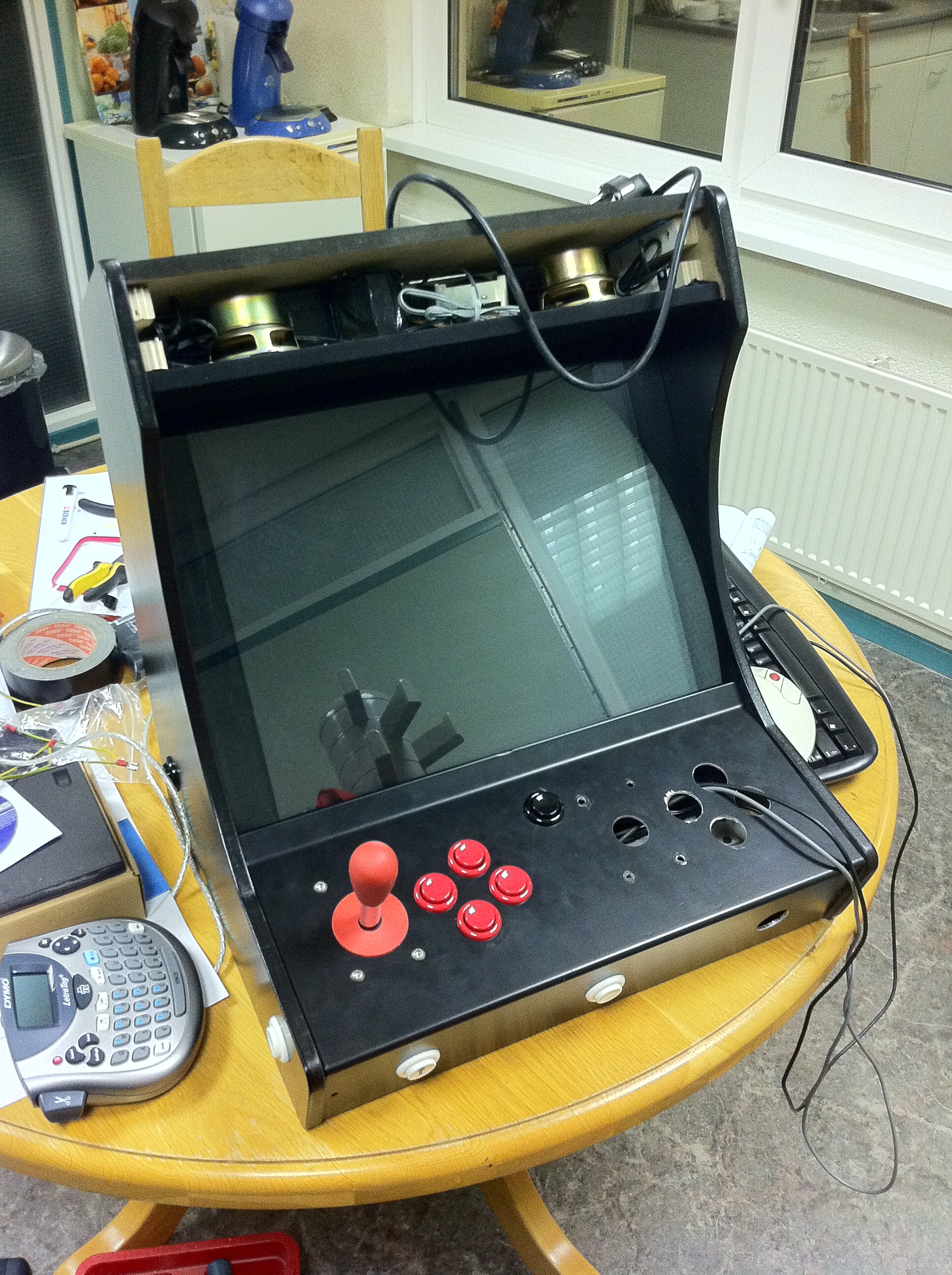 Op 18 maart was de bartop arcadekast zo ver dat hij eens lekker kon worden getest. De gehele kast is klaar, op de afdekplaat voor de speakers (bovenin) en de tweede set joysticks/knoppen na. Origineel wilde ik een joystick en een trackball, maar de grote kast waarin de trackball van biljartbalformaat zat, paste niet onder het aluminium controlepaneel. Toen maar besloten om er een 2 player kast van te maken.