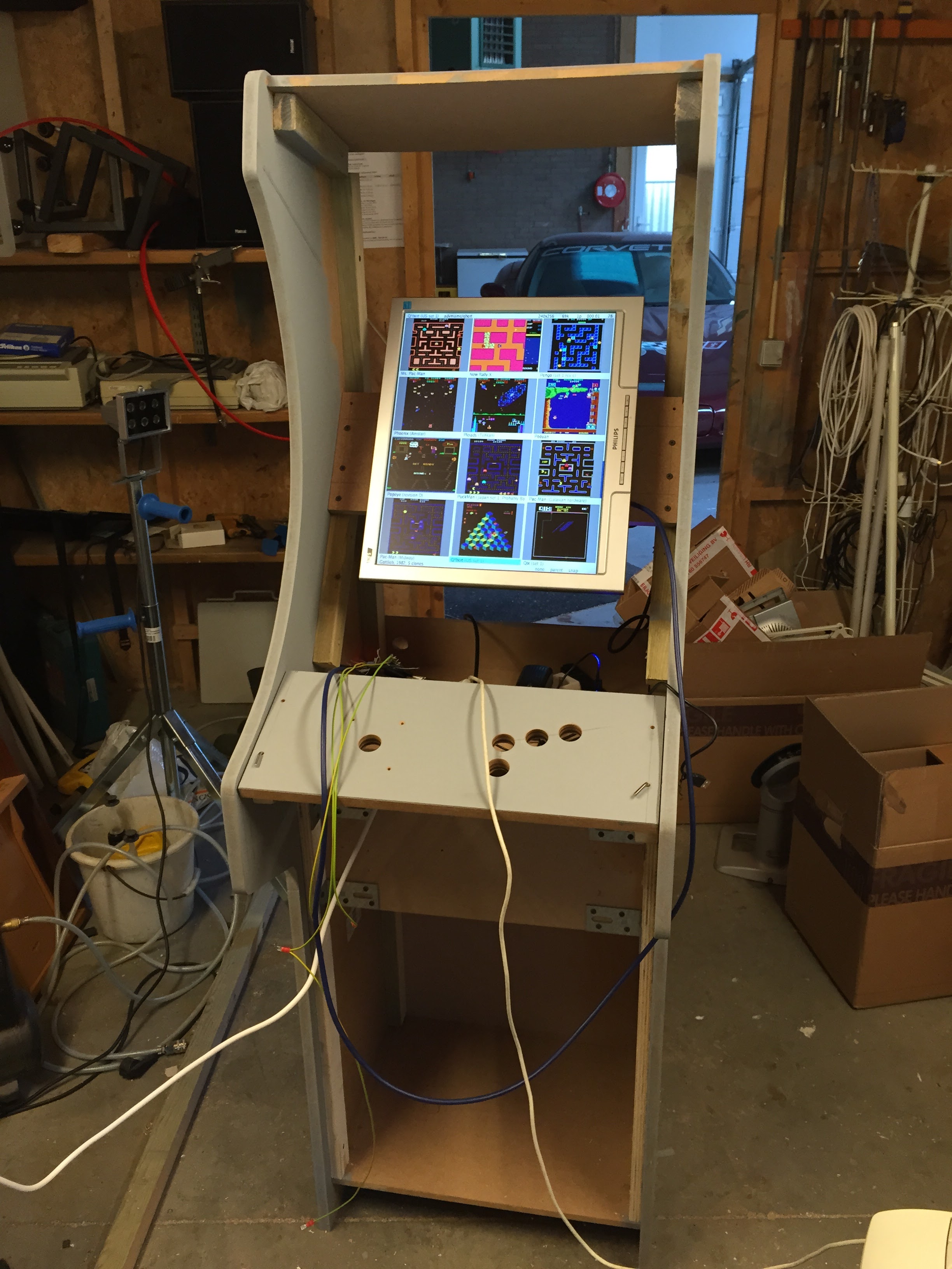 Na twee keer de software opnieuw te hebben moeten installeren heb ik in 2017 besloten om de Raspberry Pi2 te vervangen door een 60 in 1 multigame board met Jamma aansluiting. Het voordeel van een dergelijk kant en klaar multiboard is precies dat: kant en klaar. Alles werkt gewoon gemakkelijk met de joystick en is ook veel meer hufterproof dan een opstelling met de Raspberry Pi of met Windows en Mame (een enkele keer willen die Windows machines nog wel eens een Windows popup naar voren smijten). Wel heb ik het idee dat deze boards minder goed werken met LCD schermen en hierdoor vaak de spellen iets vertraagd afspelen, wat hoorbaar is in het geluid. Muziek is soms ronduit vals en vervormd. Blijkbaar zou dit minder erg moeten zijn wanneer je een CRT monitor aansluit, dus dat wil ik nog eens testen.