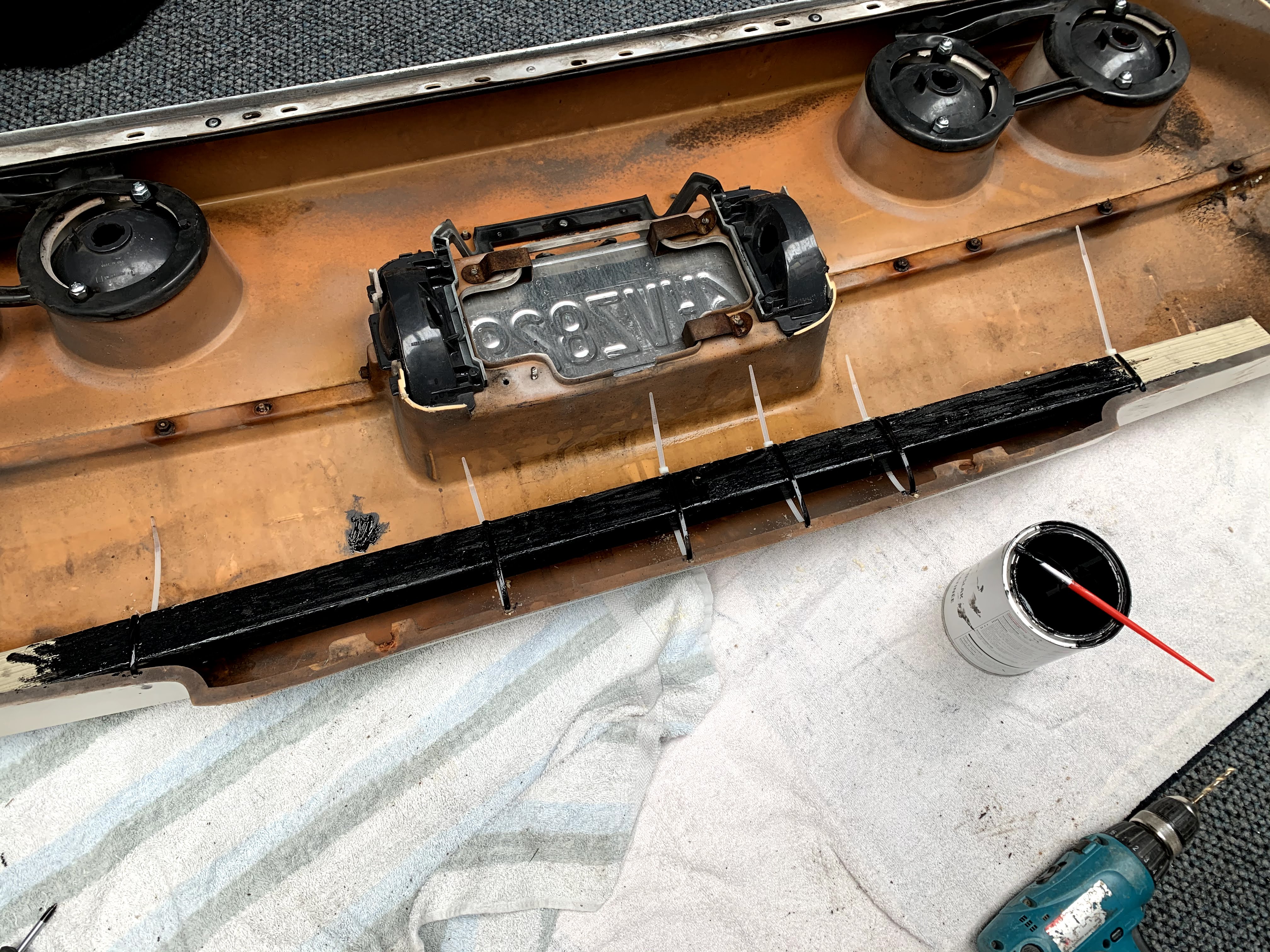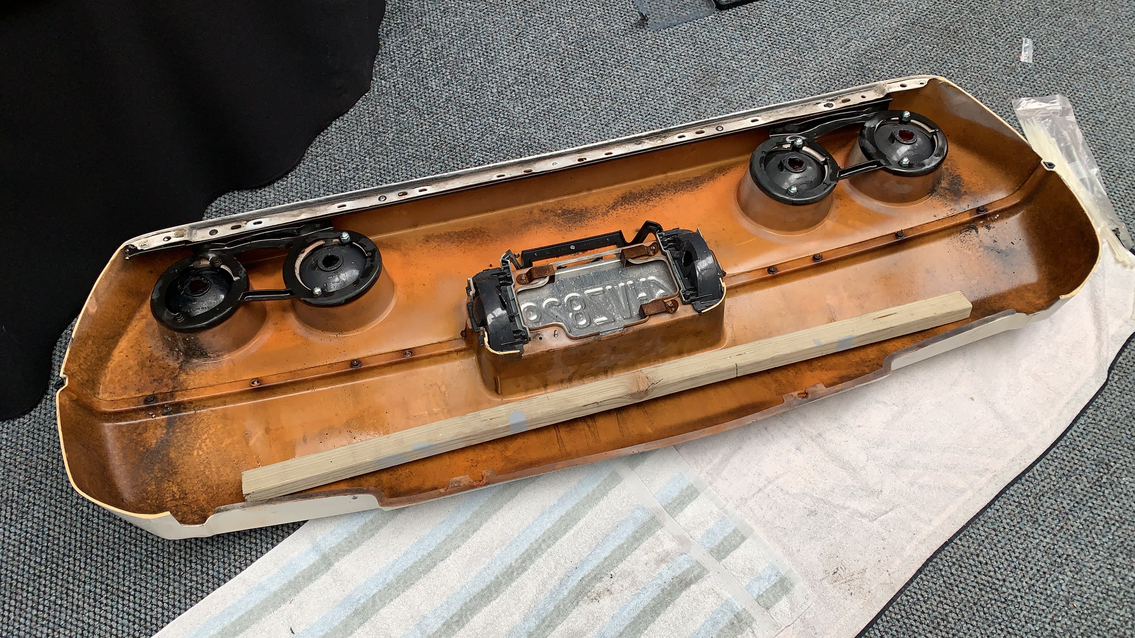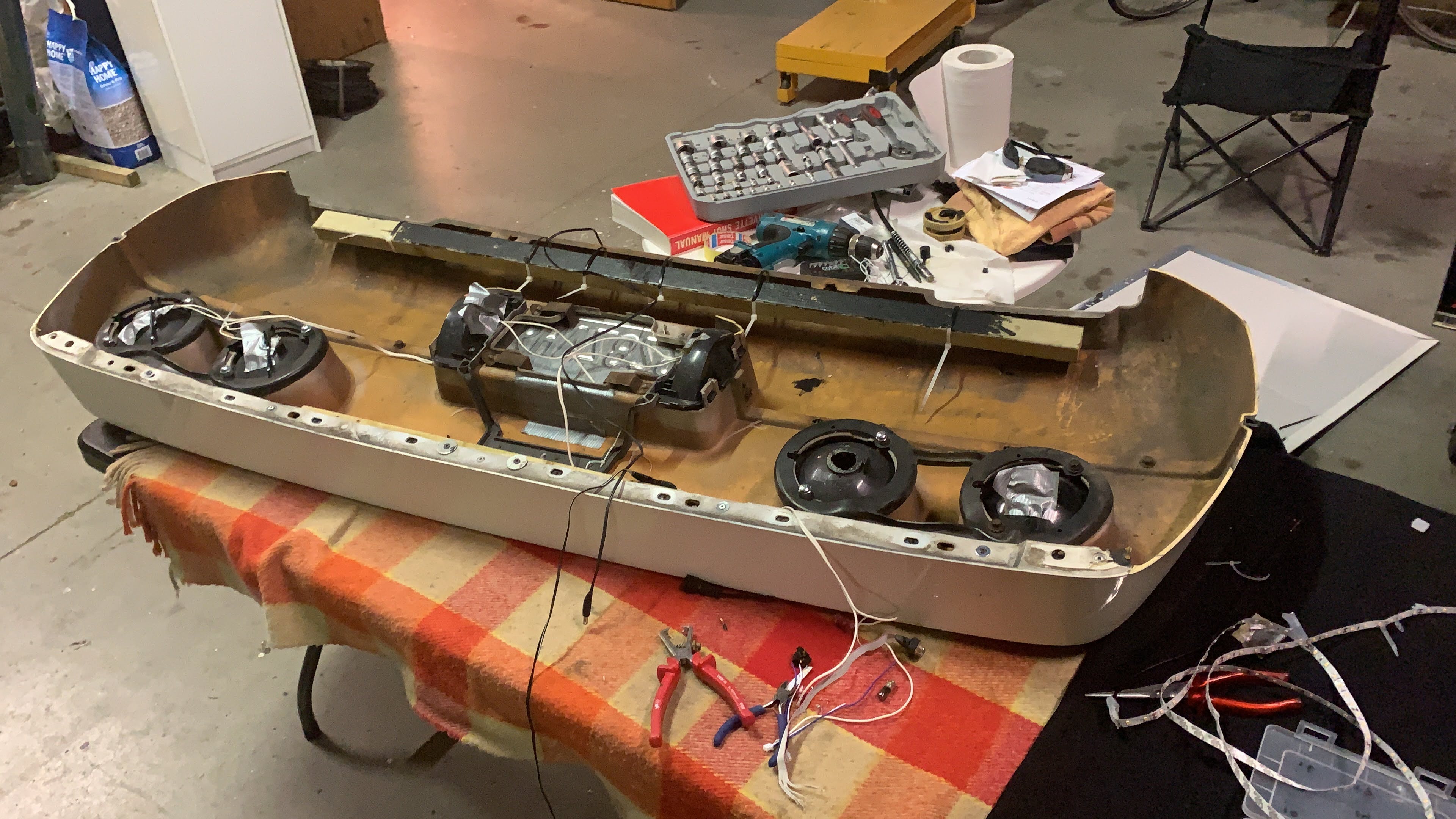 Hierna konden de lampen worden ingebouwd en aangesloten. De bevestiging van de achterlichten was niet meer volledig schadevrij en het was een uitdaging om alles een beetje netjes te monteren. De kont was door de aanrijding blijkbaar toch aardig vervormd geweest. Omdat ik geen originele lampfittingen had en ook eigenlijk geen originele lampen wilde monteren heb ik de achterkant van de armaturen afgeslepen zodat ik simpel eigen lampjes kon plaatsen in alle zes de lichtarmaturen.