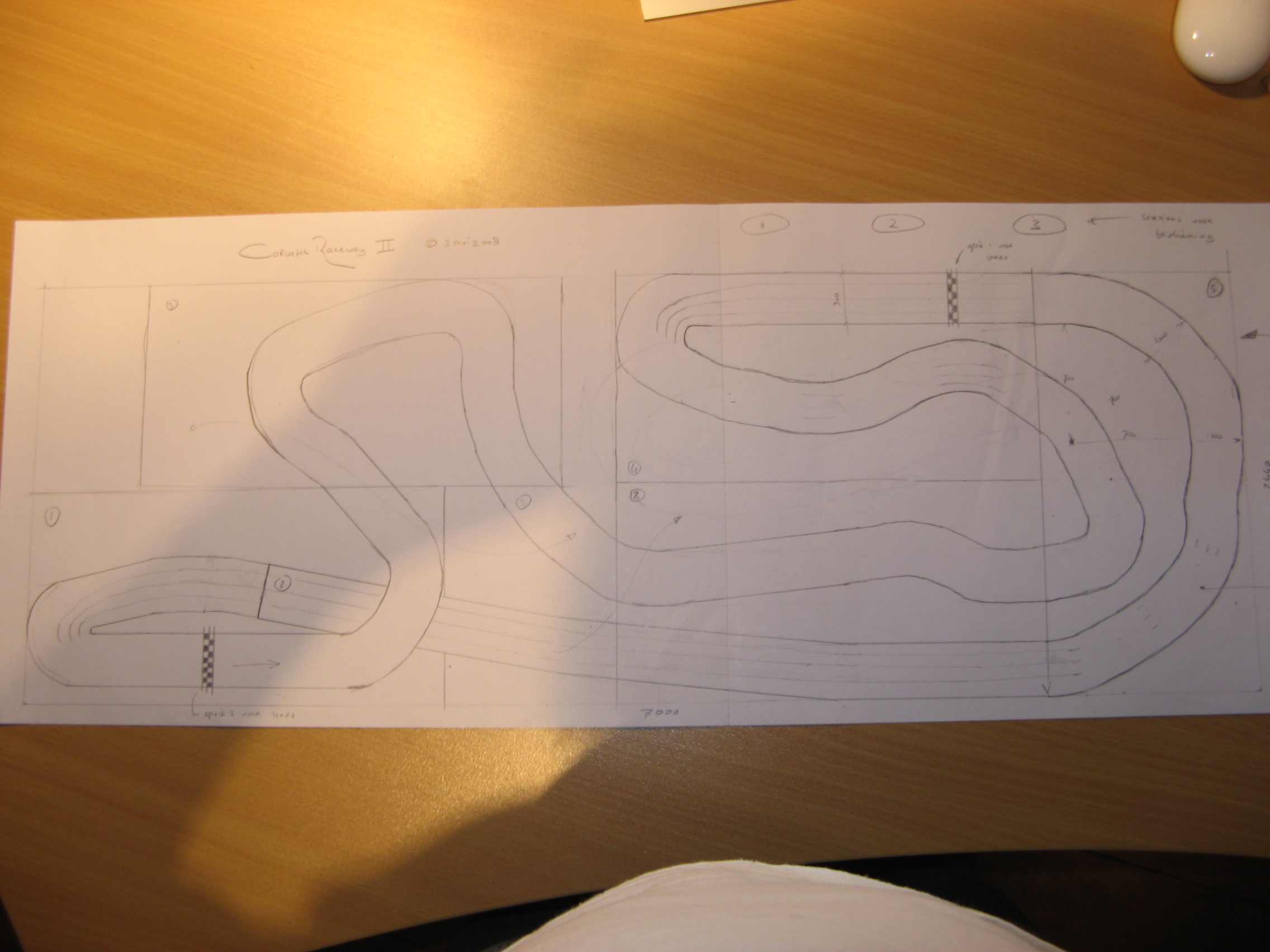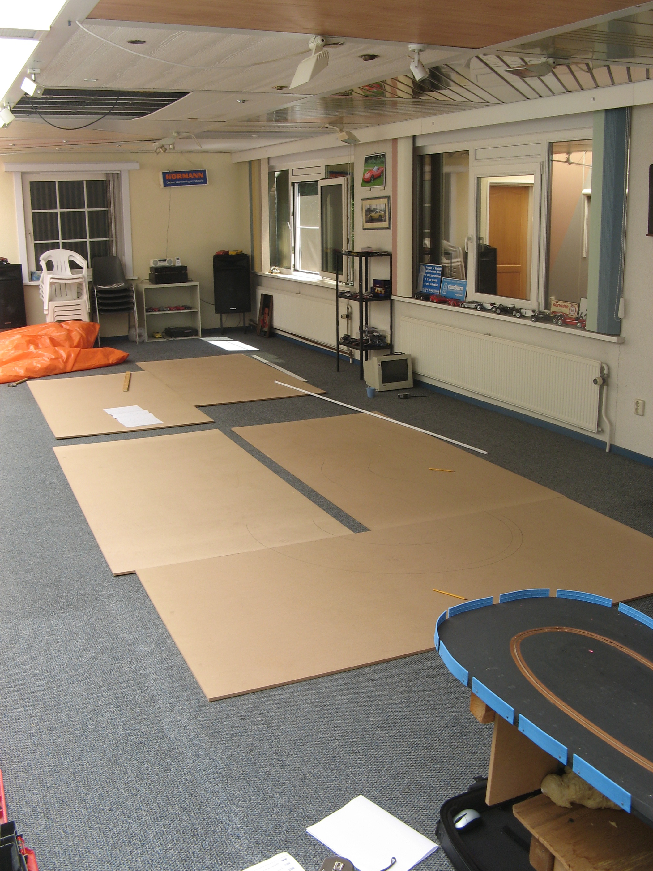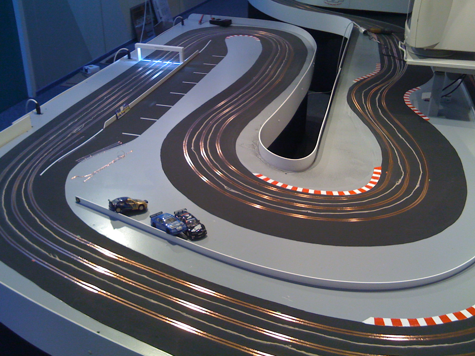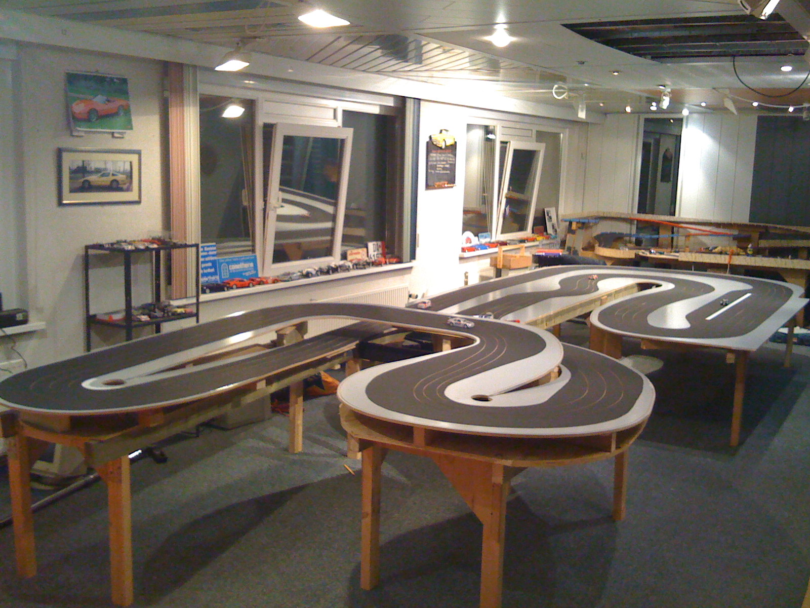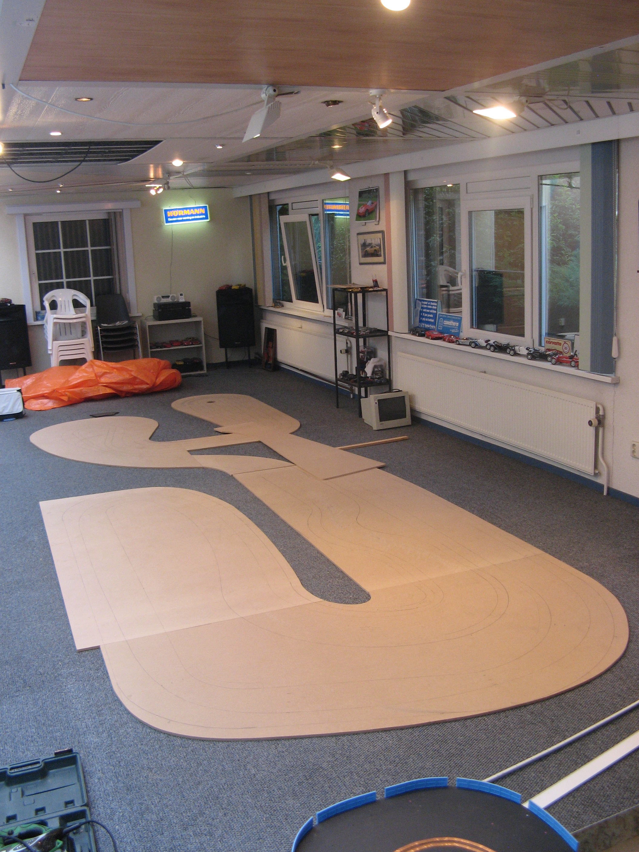 Iedereen kent wel de racebaan met plastic auto’s en het “knijpertje” waarmee je je auto’s rond laat razen. Leuk voor kinderen, maar opvallend vaak ook erg populair onder volwassenen. Na eerst wat lacherige opmerkingen zoals “da’s toch voor kinderen?” zijn ze na een half uurtje niet meer weg te slaan bij de baan en staan de kids met een pruillip toe te kijken. Herkenbaar? Stel je nu eens voor dat dit speelgoed op “Toolman Tim” manier tot grotere hoogte wordt getild en dat je met je modelverzameling Camaro’s en Corvettes tegen elkaar kunt racen… Mij leek dat wel wat en na enkele maanden knutselen was mijn project in mei 2008 eindelijk klaar: een 26 meter lange driesporen racebaan genaamd Corvette Speedway.