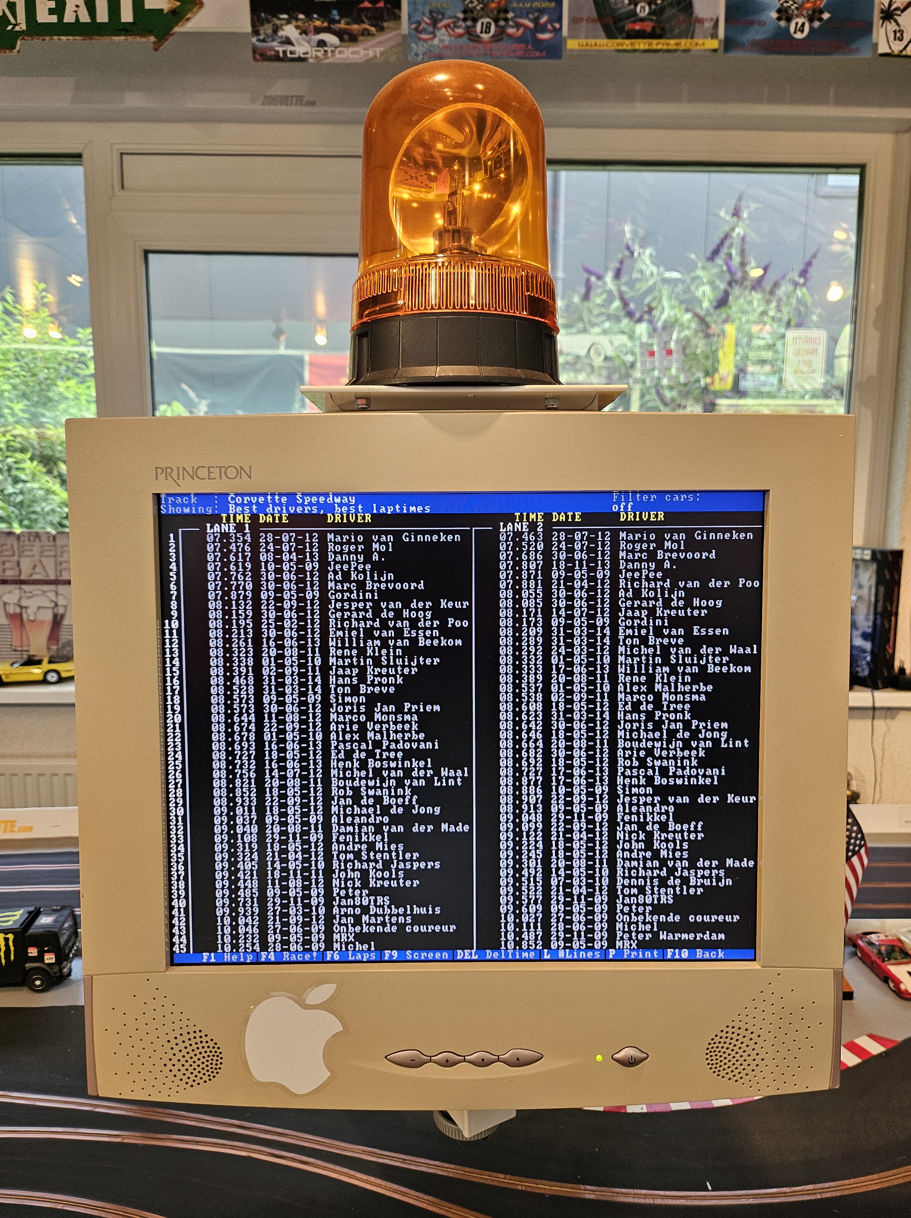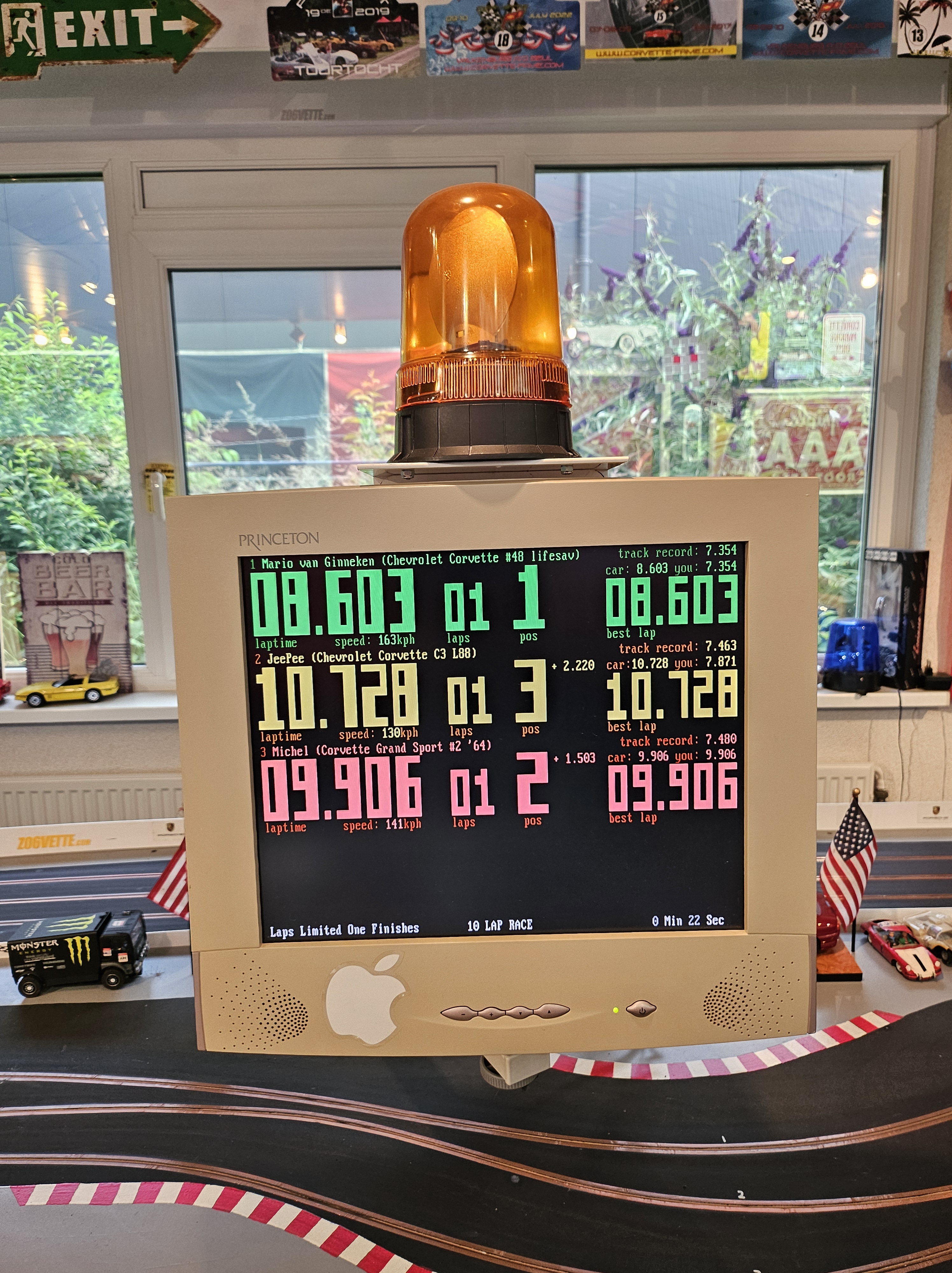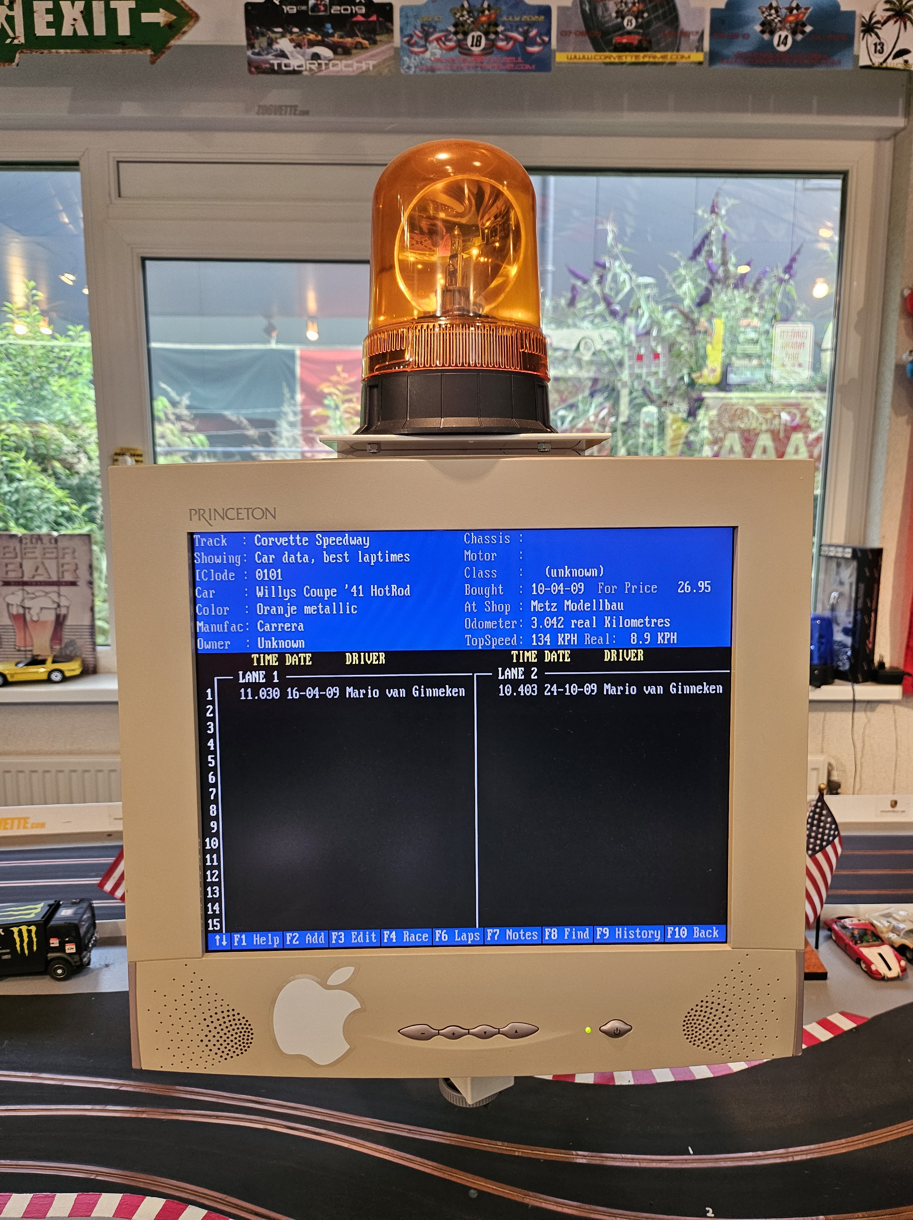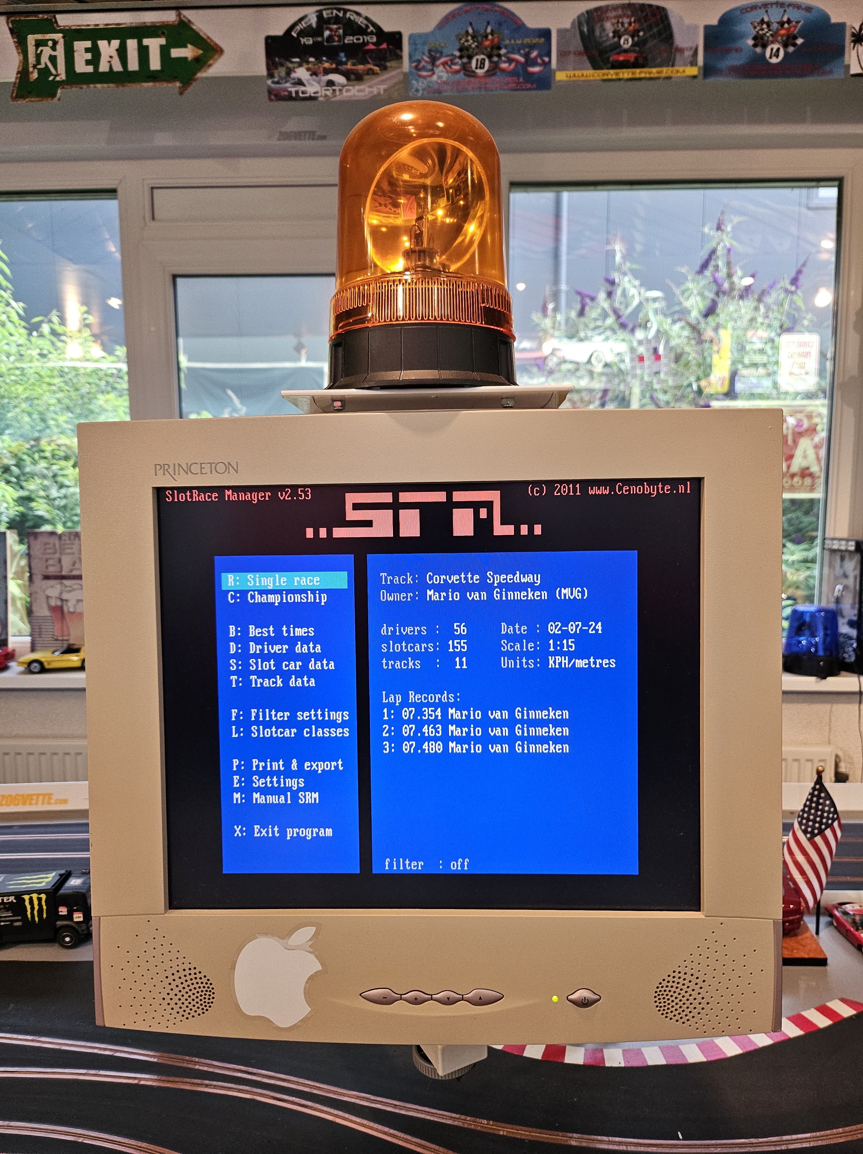 Tijdmeting gaat middels optische sensoren op de start/finish (vierkante blokjes in de baan) en wordt bijgehouden door een oude 80486 PC die op MS-DOS draait en op duizendsten van seconden de rondetijden bijhoudt en opslaat. De “Slot Race Manager” software hiervoor heb ik lang geleden geschreven in Quickbasic en Foxpro en bevat alle auto’s in de collectie en alle coureurs die op de baan racen, inclusief hun beste prestaties. Ook maakt deze software het mogelijk om een kampioenschap op te zetten met meerdere deelnemers of om gewoon lekker een race te rijden. Een door de computer aangestuurd zwaailicht geeft start en einde van een race aan.