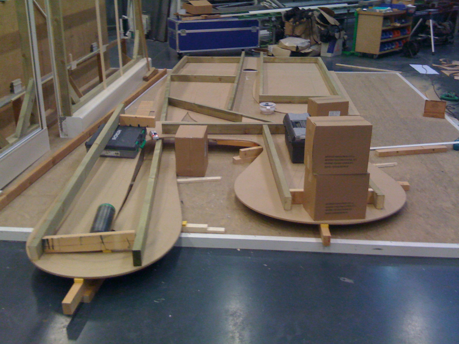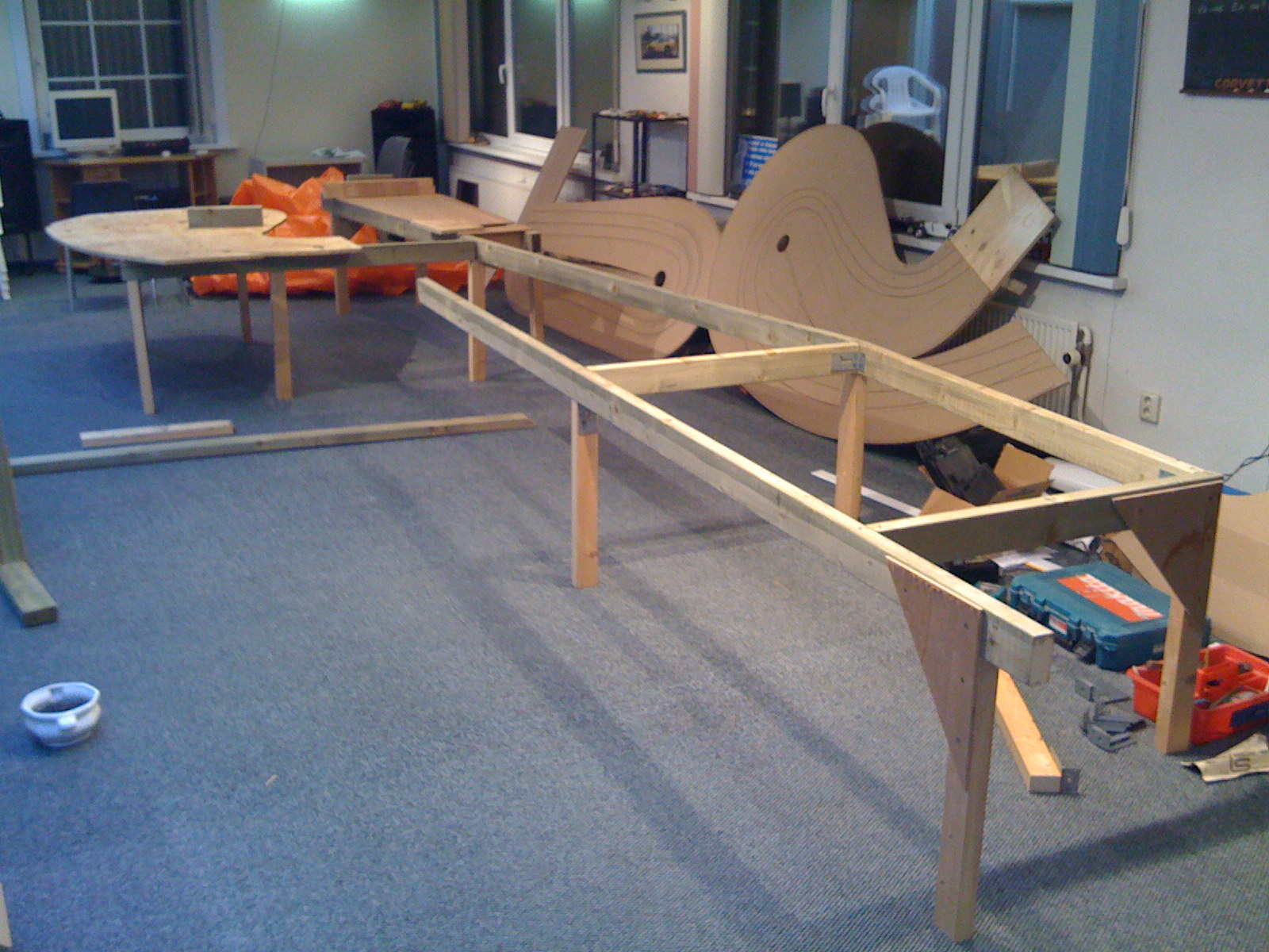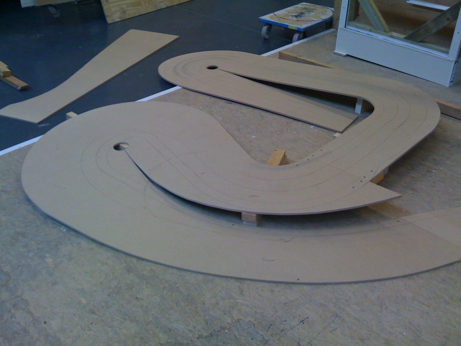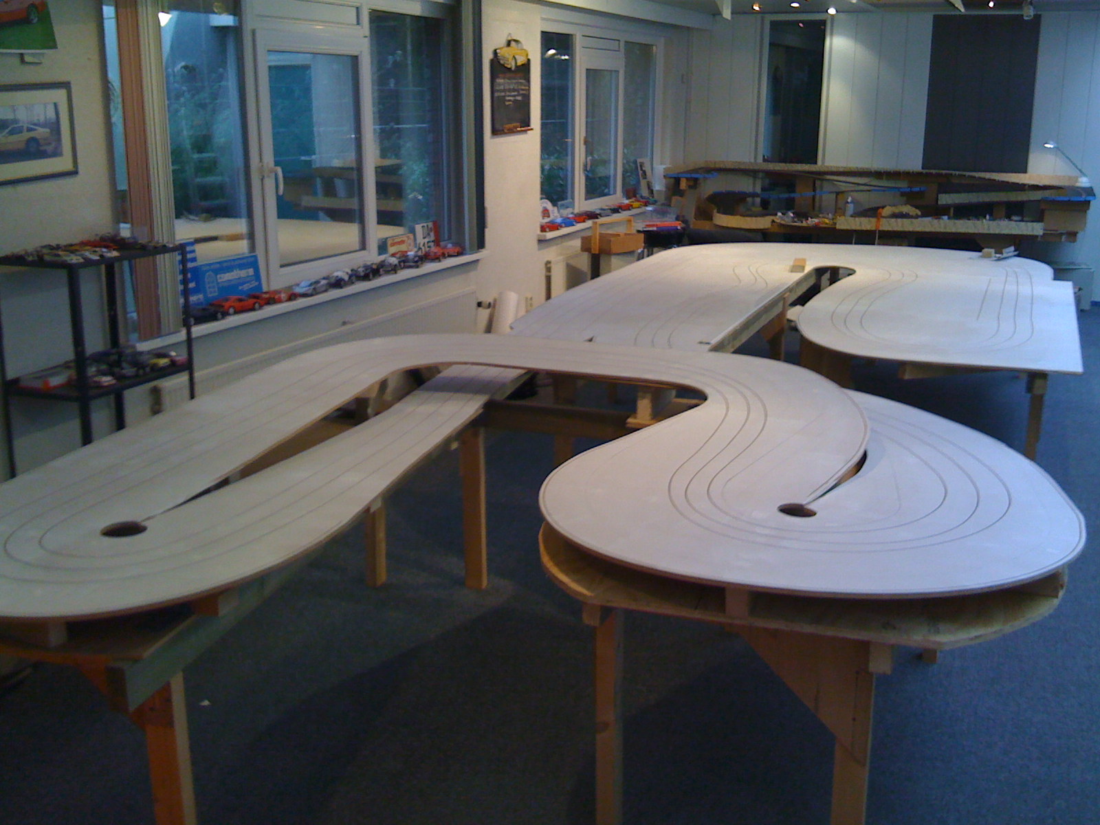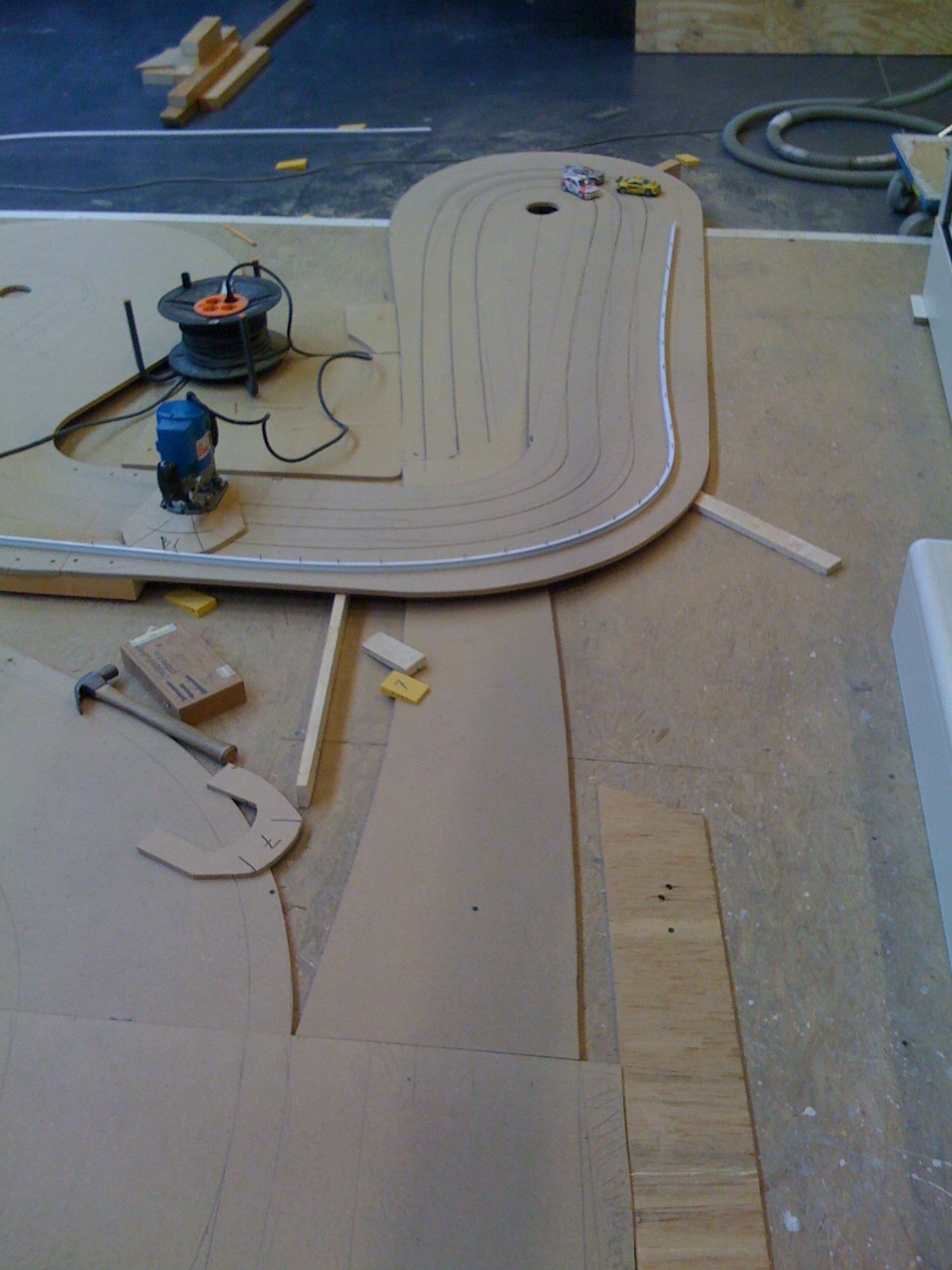De racebaan bestaat uit een tafel van ongeveer 6 x 2,5 meter welke is opgebouwd uit zes MDF platen van 12mm dik die op een frame van houten balken zijn bevestigd. De platen zijn gezaagd op contouren van de baan en daar waar de baan verhoogd wordt is multiplex gebruikt als basis op het frame. Met een bovenfrees en flexibele kunststof profielen als geleiding heb ik de drie sporen gefreesd en heb daarbij elke bocht een eigen straal gegeven om zoveel mogelijk variatie te krijgen. Dit is het grootste voordeel van een houten baan ten opzichte van de plastic baanstukken, waar je beperkt bent door de standaardbochten die er zijn. Ook zijn er op enkele plekken sporen vlak bij elkaar gefreesd, zodat je elkaar letterlijk in de wielen kunt rijden.