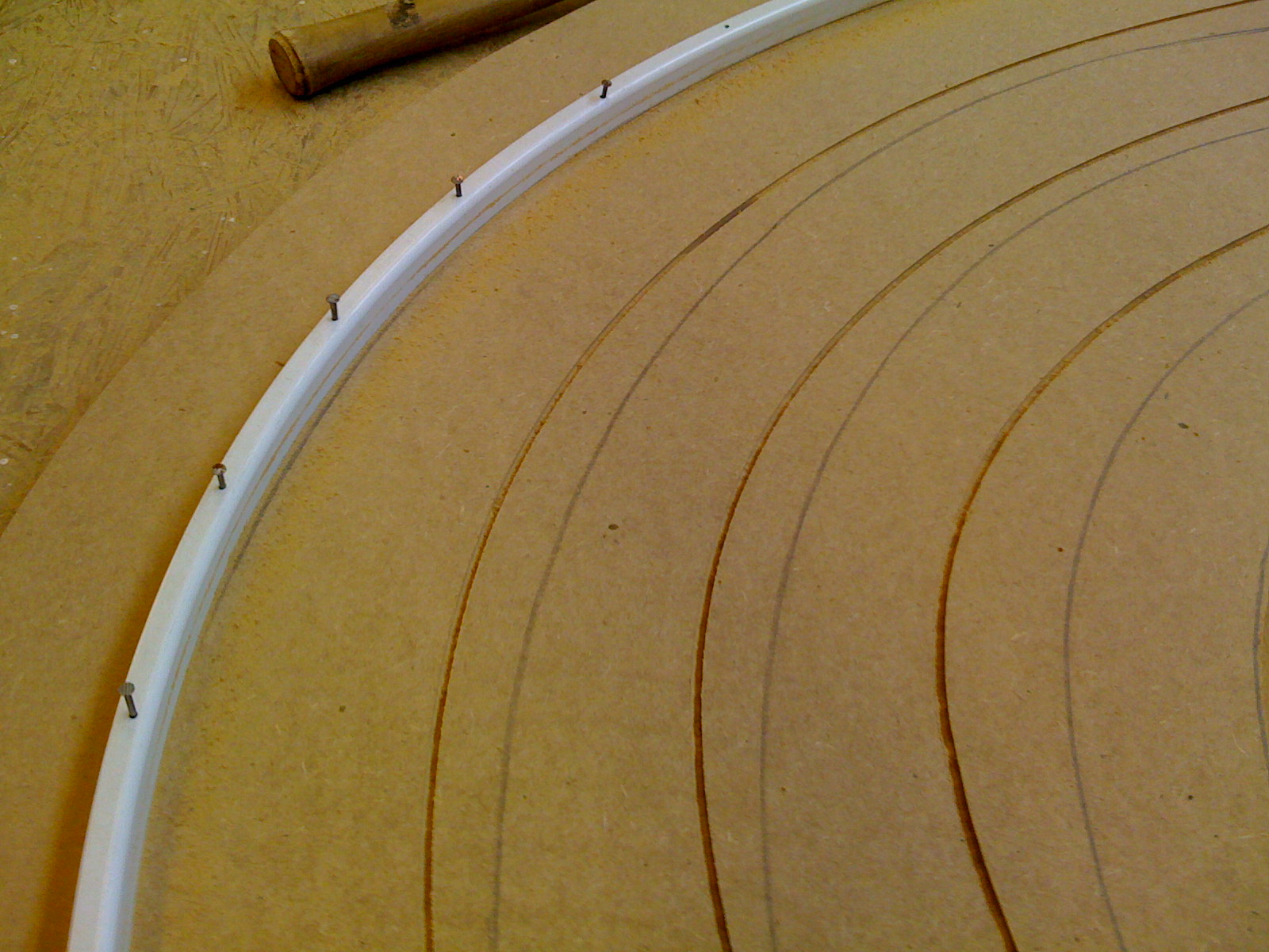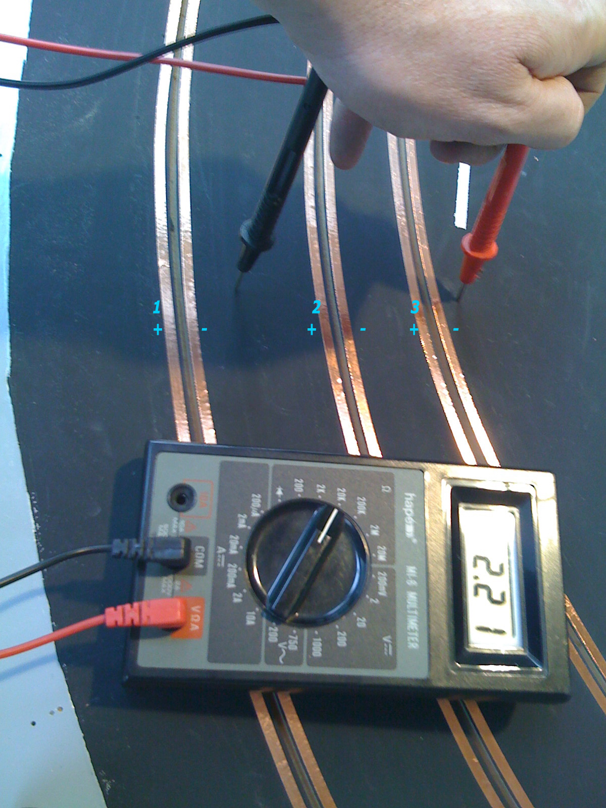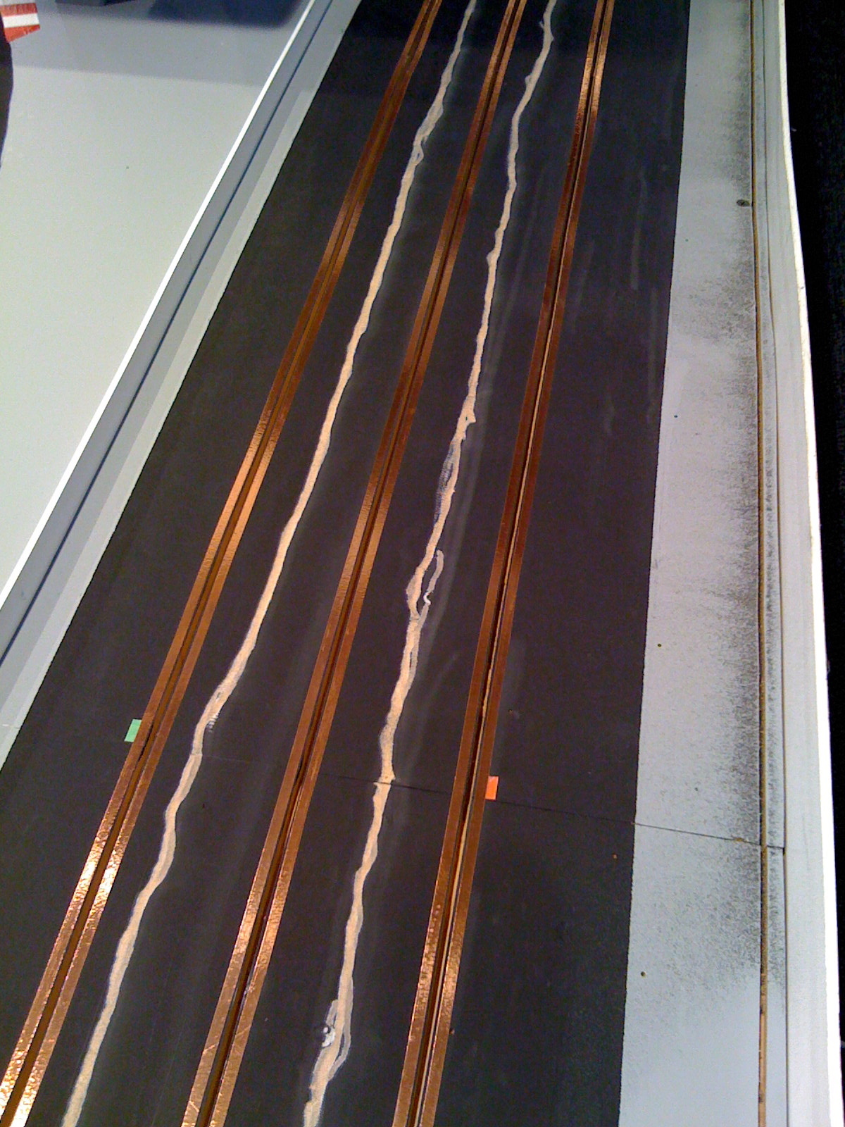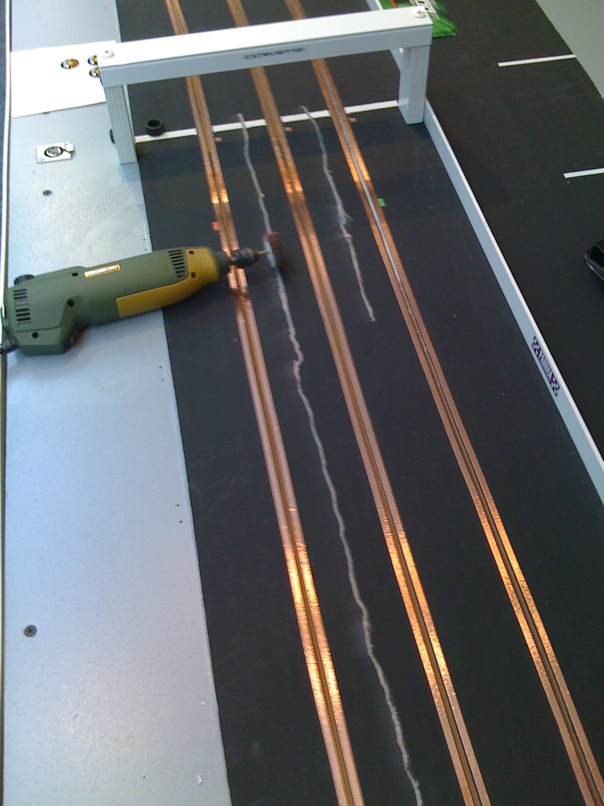 Mijn proefstuk had ik met Flexa schoolbordverf geverfd en die had inderdaad geen electrische geleiding. Voor mijn grote baan had ik nieuwe verf nodig en kocht ik wederom Flexa schoolbordverf. De verpakking was inmiddels iets aangepast… en blijkbaar ook de samenstelling! De nieuwe verf geleidde wel en dat zorgde voor stroomoverdracht tussen de 3 banen. Na een week vloeken en mezelf gereed maken om alle kopertape eraf te trekken en alles opnieuw te verven schoot me een noodoplossing te binnen die me waarschijnlijk tijd en geld zou besparen: ik maakte een stroomonderbreking door over de volledige lengte van de baan de verf een halve centimeter weg te halen. Dit deed ik met een Dremel en een schuurkop en dit kostte me relatief weinig tijd. Met de multimeter op de baan haalde ik de laatste centimeters weg en tot mijn vreugde bevestigde de multimeter dat er geen stroomgeleiding meer was. Met andere verf (die ik vooraf testte!) de strepen overgeverfd en we waren weer op de goede weg.