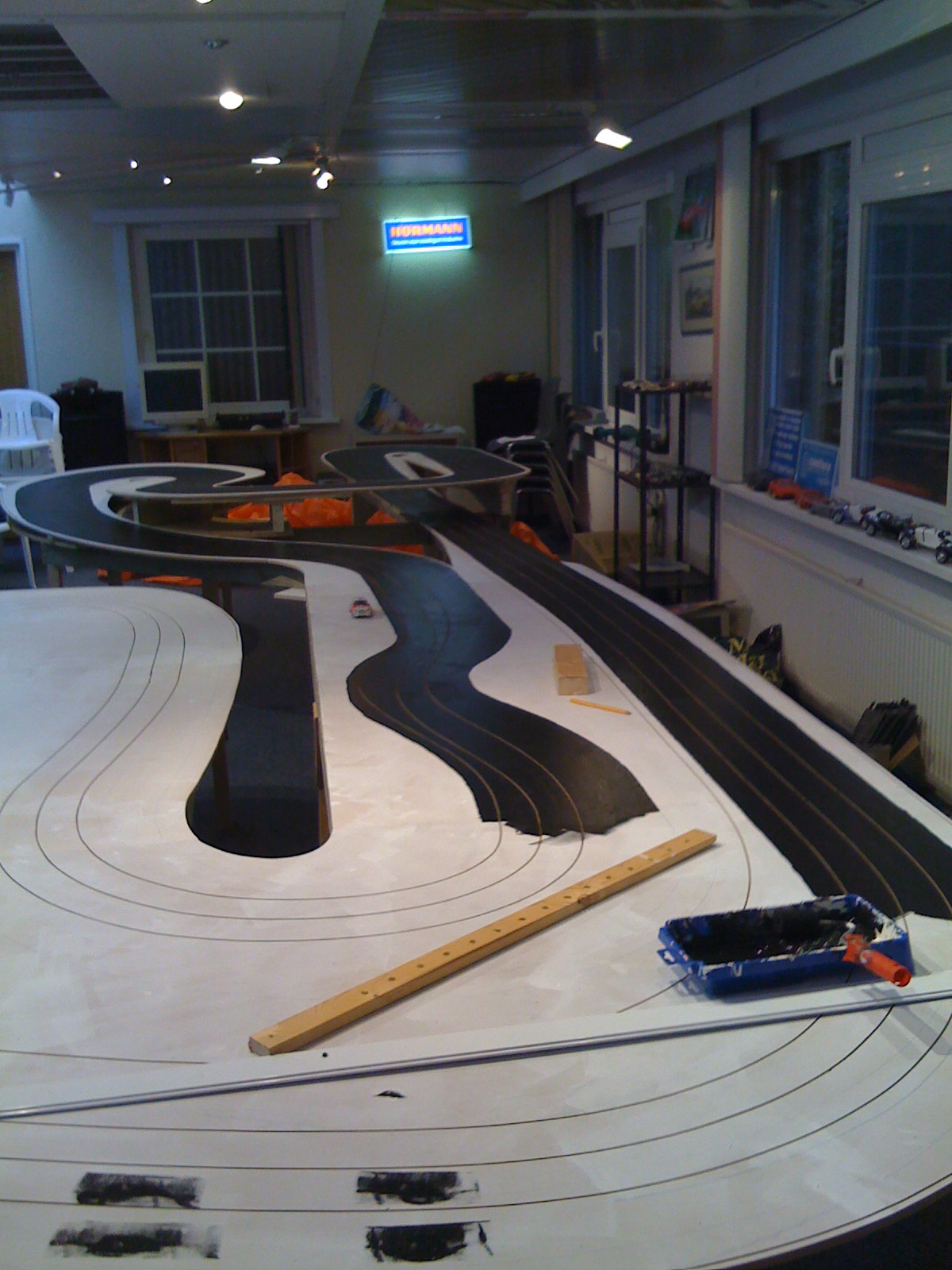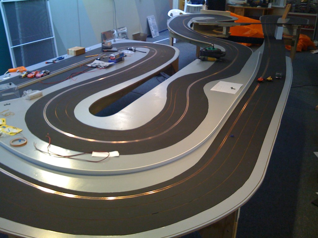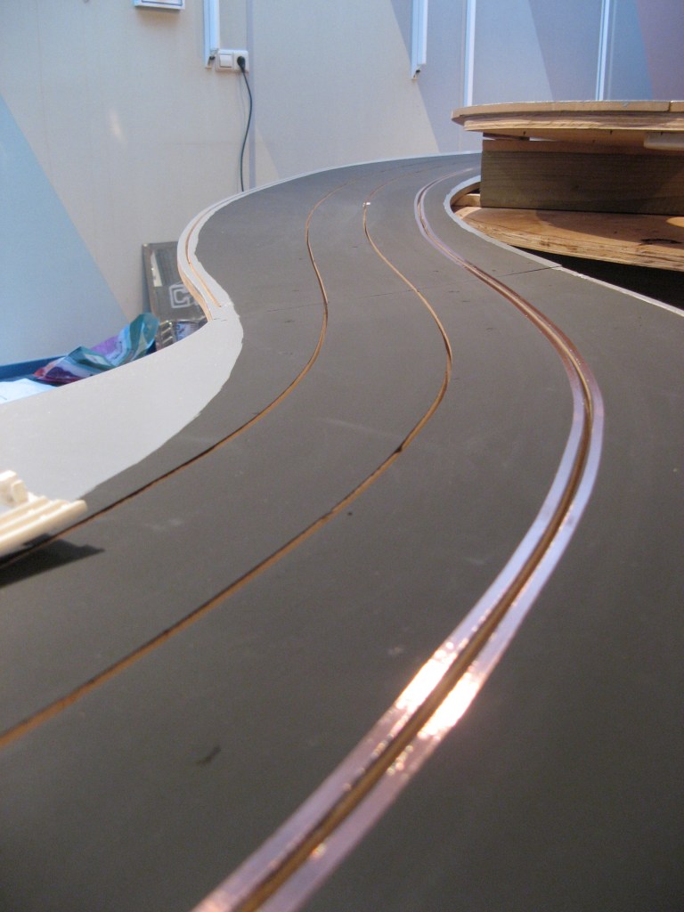 Hierna is de baan zwart geverfd met schoolbordverf, dat door het matte oppervlak de perfecte grip geeft. De stroomgeleiding vindt plaats door middel van kopertape dat gebruikt wordt bij het hobbymatig maken van glas in lood en deze wordt ongeveer elke vier meter naar de onderkant van de tafel geleid en aangesloten op een ringleiding van dikke kopertape. Dit verzekert een optimale stroomgeleiding en bij een beschadiging in de folie blijft stroomgeleiding intact en hoeft bij reparatie maar een klein stuk te worden vervangen. Een zware regelbare voeding zorgt voor stroom op de baan die voor de standaard schaal 1/32 auto’s op 12 volt staat en voor de grotere 1/24 auto’s naar 18 volt kan.