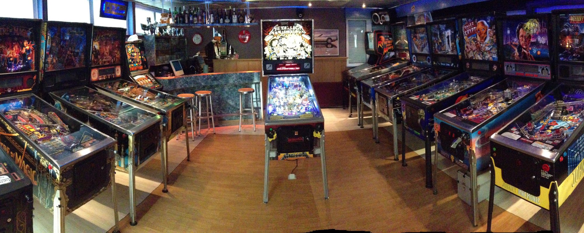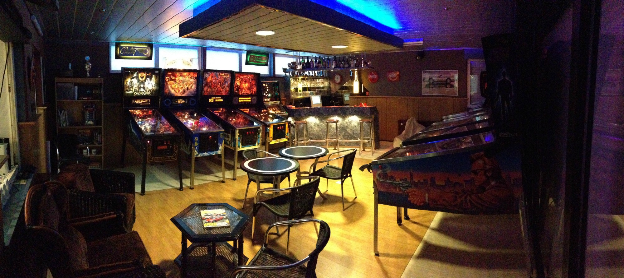 De game room zoals hij er in 2021 uitziet. Er is een aantal flipperkasten vertrokken om ruimte te maken voor een gezellige zithoek met beamer en karaoke-opstelling. https://youtu.be/WyCzPC_V-H4
