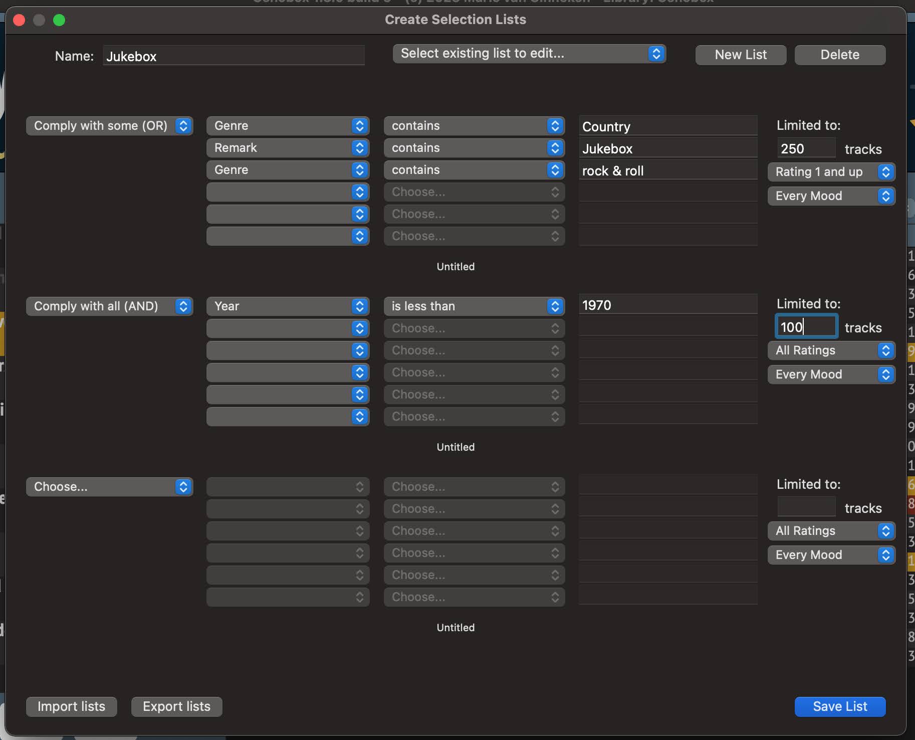 Creating a Selection List named “Jukebox”. You can see that you can set up three selection filters, each with their own limit and up to six filter criteria. This Selection List results in a total of 350 tracks (unless there are tracks that fall under both filter criteria).