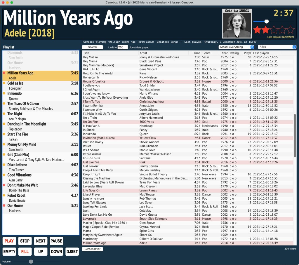 Cenobox was created out of frustration with the iTunes/Apple Music software, which I used from 2005 to 2023 to manage and play my ever evolving music collection. The software became too bloated when iTunes changed to Apple Music and I missed the "iTunes DJ" that used to be in the software: a list of songs that where coming up next and was running on a Smart Playlist. I started fantasizing about all the things I might want in such a piece of software and before I knew it, I had a list of Must Haves and started to work on the software (with working title "Cenojuke").