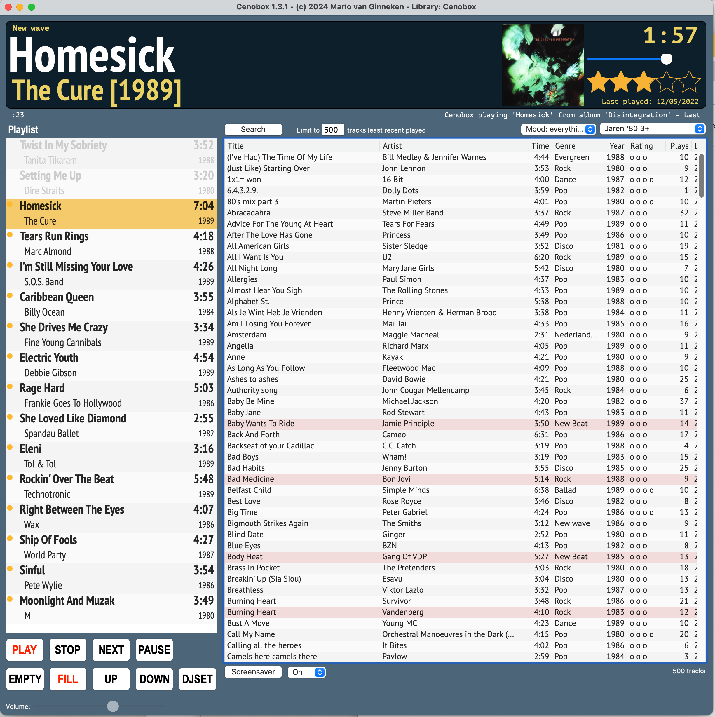 This is the main screen of Cenobox. On the left is the Playlist showing upcoming tracks. You can rearrange tracks or double click tracks so they pop to the top of the list. The software keeps your Playlist filled and randomly chooses the tracks from the list on the right side: the Selection List. This can be your complete collection or a live updated list based on selection criteria you specify, like “Genre contains Country” or “Year < 1980” or “Remarks contain Marion Favorites” or “Mood = relaxed”. Of course you can also use a combination of these criteria. When creating a Selection List it’s always wise to set a Limit. If you set a limit of 500 tracks, these will be the 500 tracks with the oldest Play Date. This way you will never hear tracks repeatedly, unless you choose to.