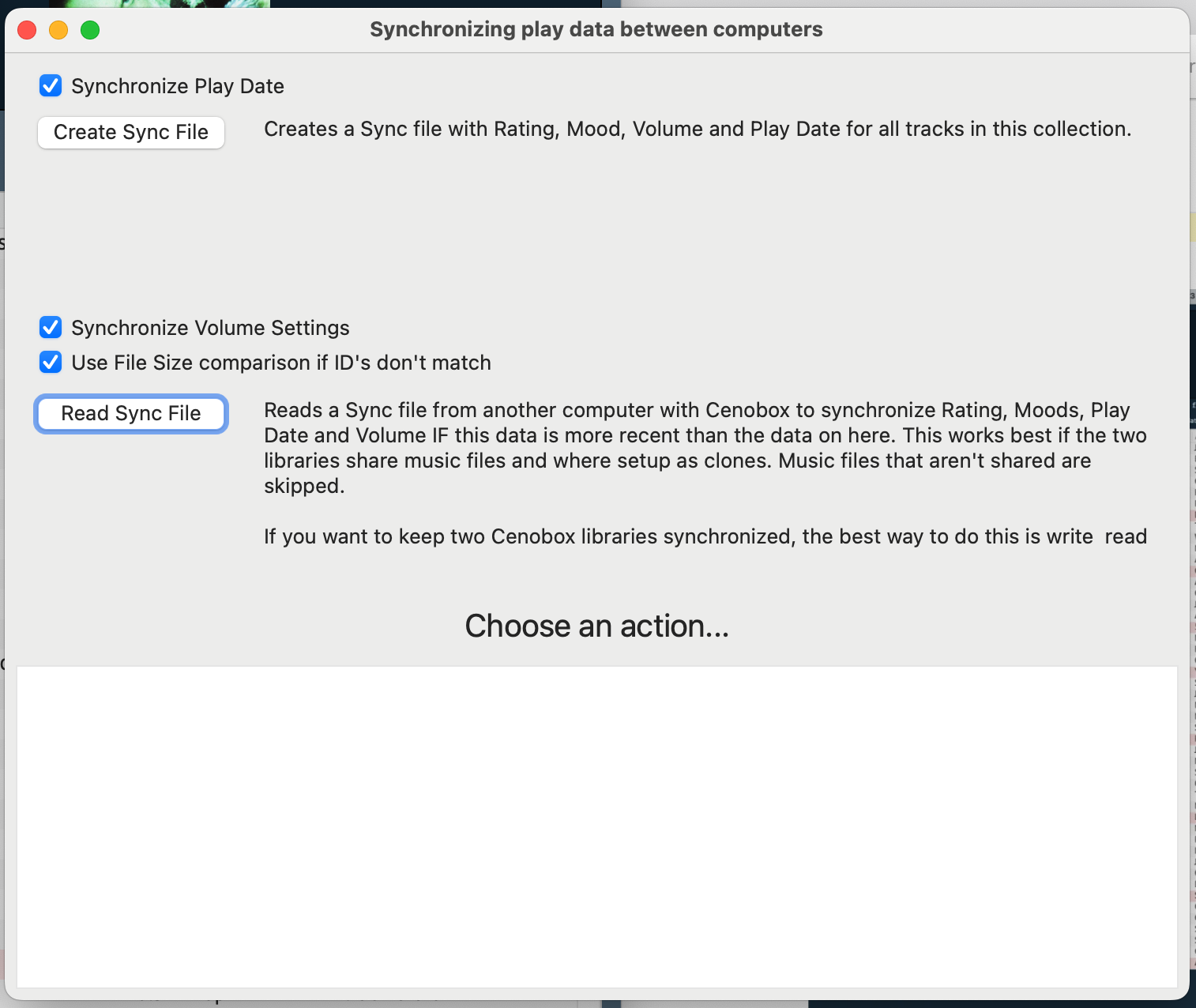 Synchronize Ratings copies the database settings, like ratings, mood, volume, etc. Cenobox creates a small text file containing this data and you can read it on another computer with a similar library and this data will be synced.